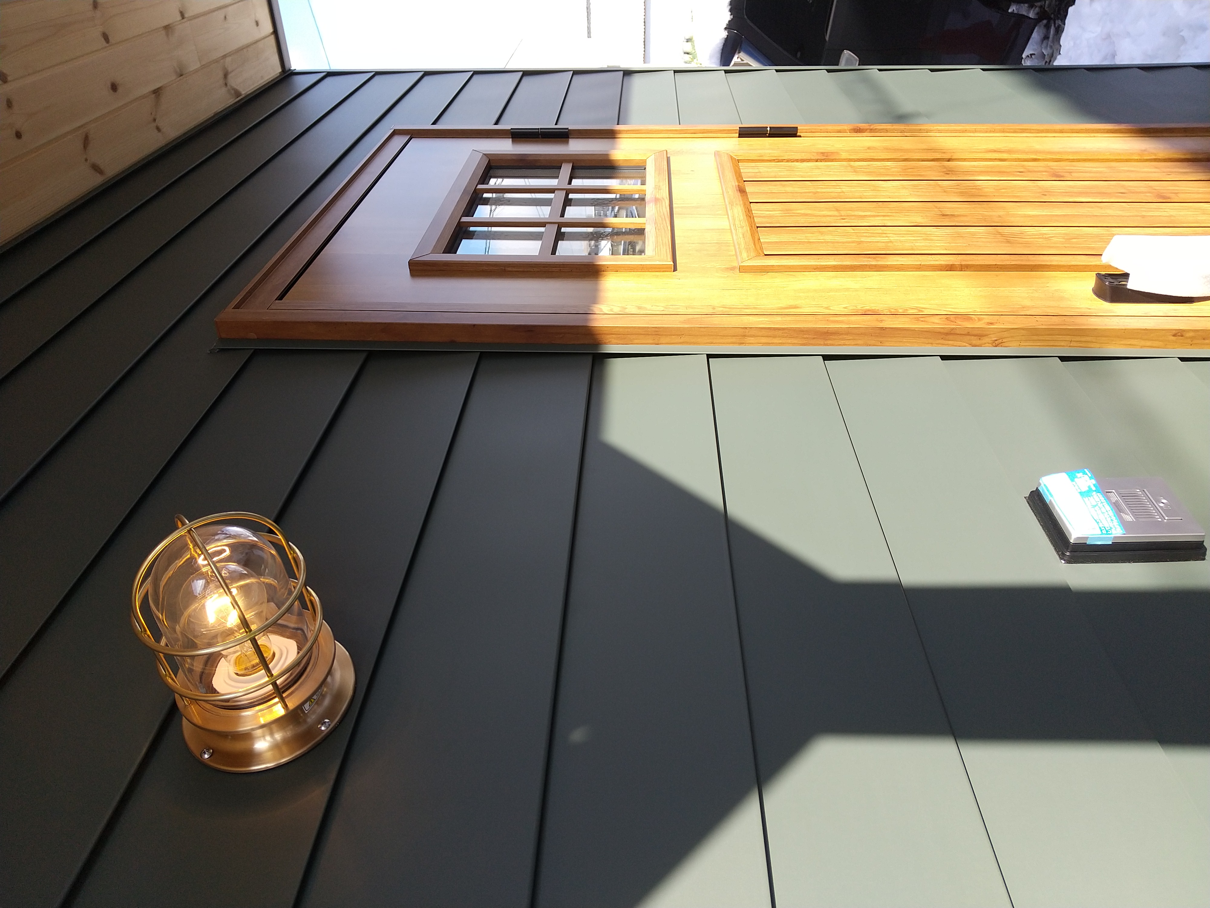 yk様邸は、サーファーズハウス風のかわいい洋風のお宅です。ミノワでも洋風の家を建てれるんですよ。外壁はガルバリウム鋼板の横張り、大屋根は茶色の平板瓦に1階部分の庇はガルバリウム鋼板の横葺き、正面となる南面はサッシ周りを板金の枠で囲み、あえて窓を強調しているところがかわいらしく感じさせますね。