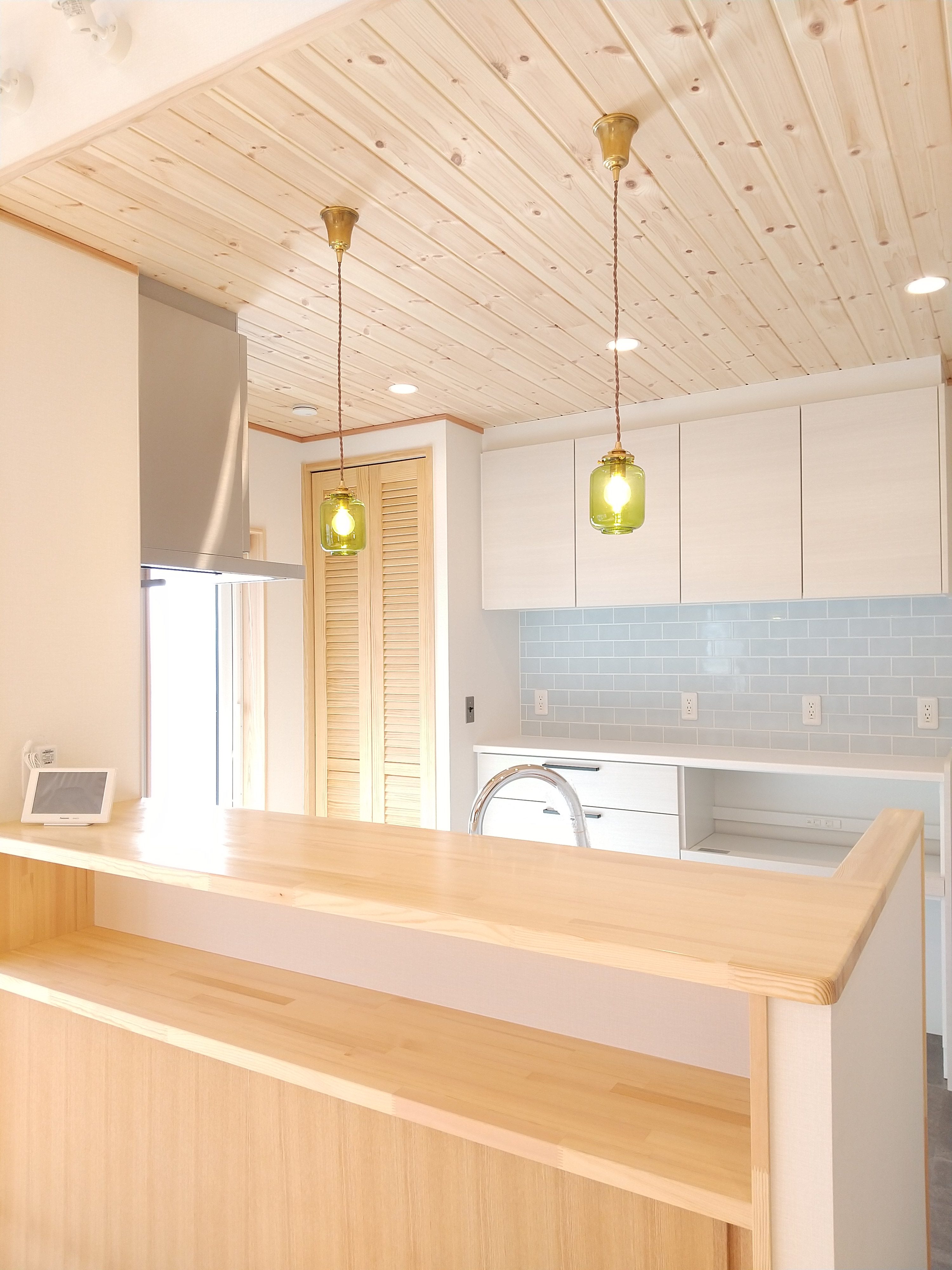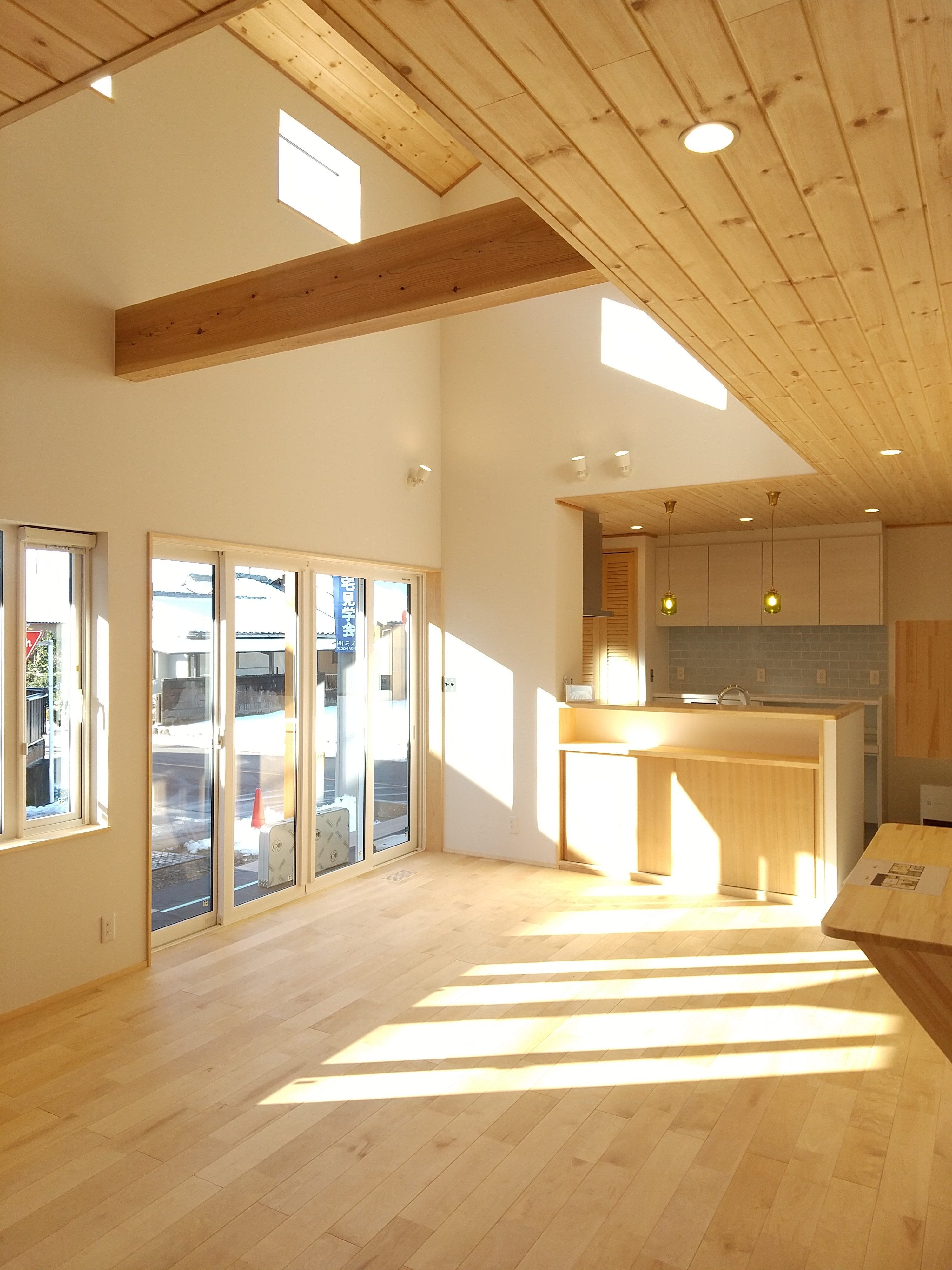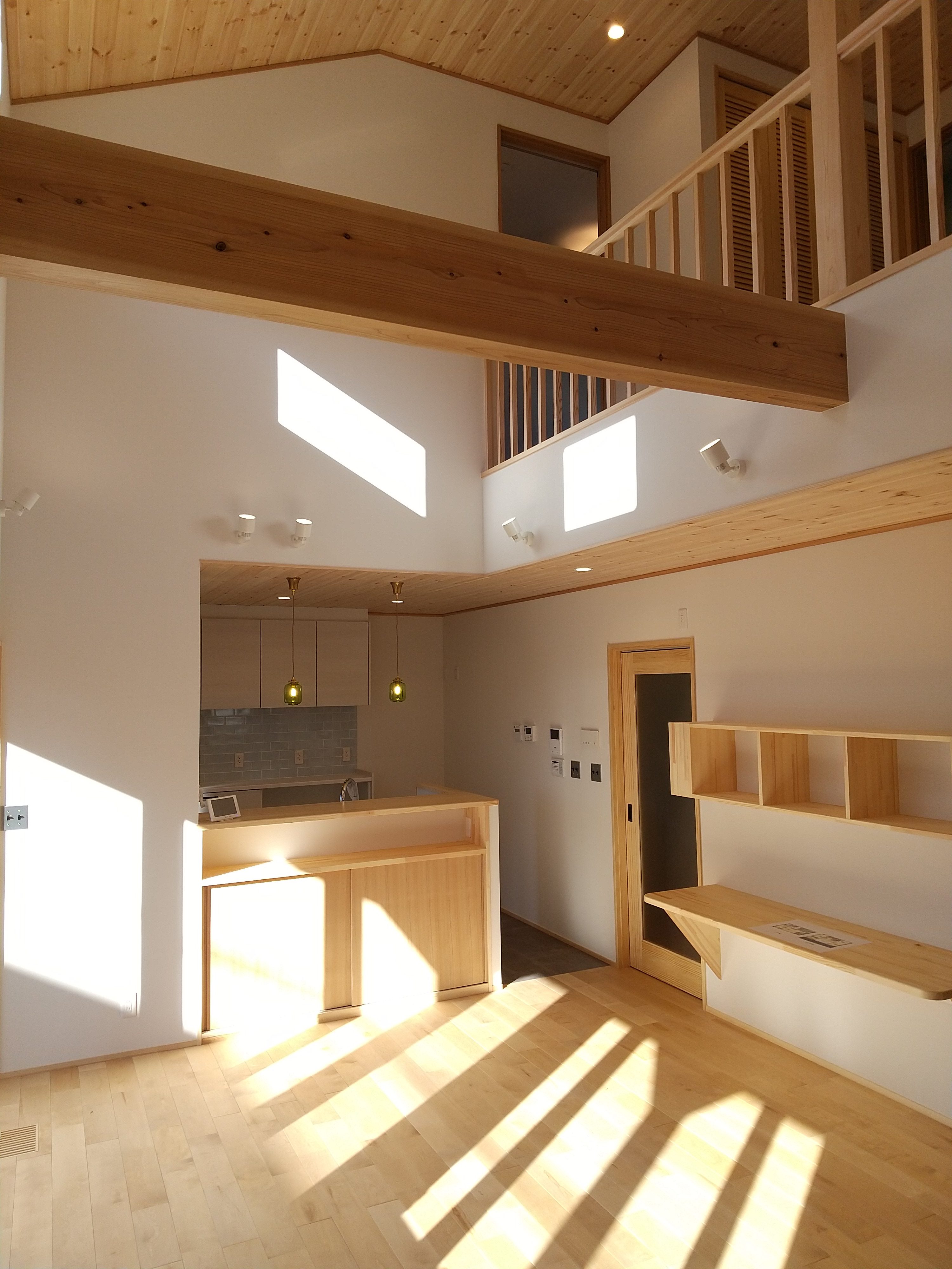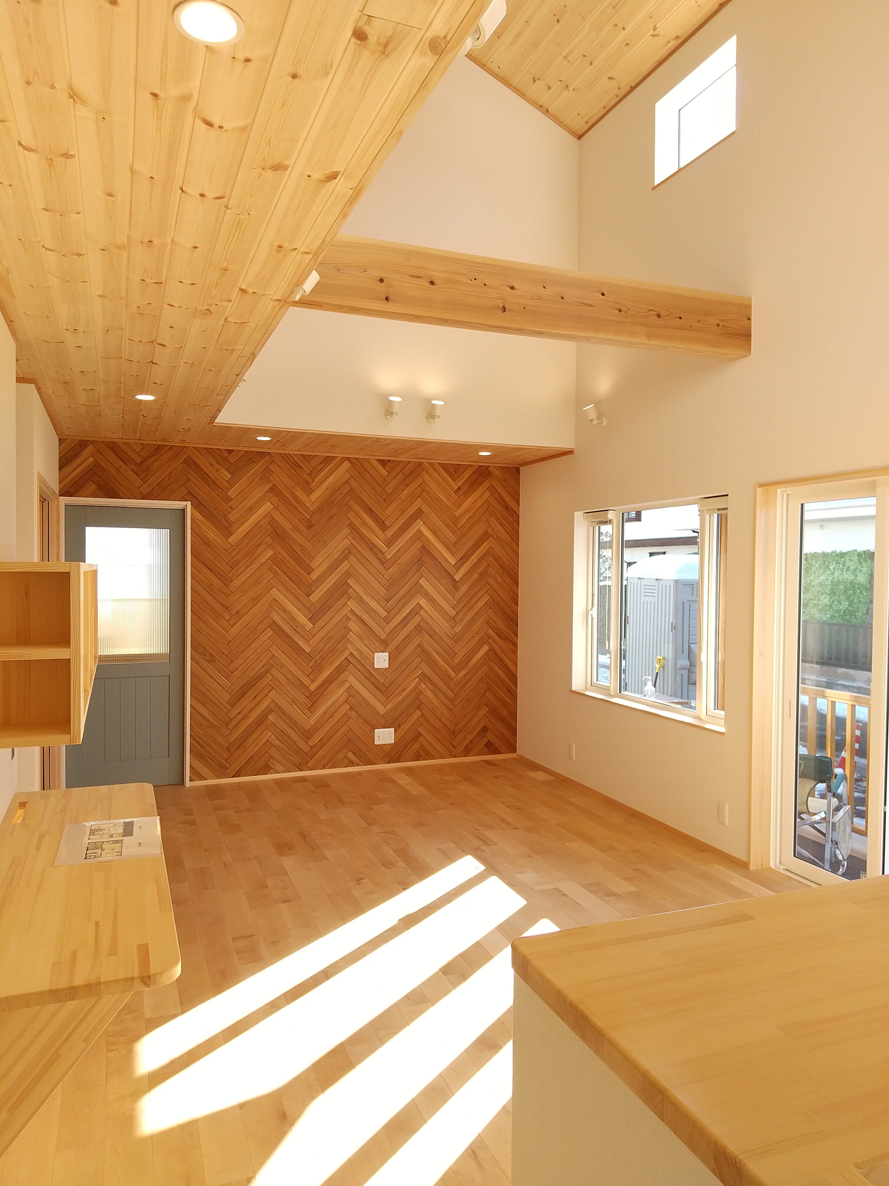 ホールの扉を開けると、開放的な吹き抜けのある18帖のLDKに入ります。天井の羽目板は、外の軒裏と合わせてパイン材にされました。ミノワでもよく使う材料ですが、いつもとは違った場所に張ることでまた雰囲気も変わってきますね。