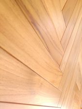 TVボードの背面には、チーク材のヘリンボーンが張られています。開きにした魚の骨に似た形状から、その名がついたそうです。これ、張るの大変なのです💦h谷川棟梁、がんばりました💮👏