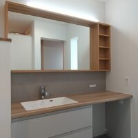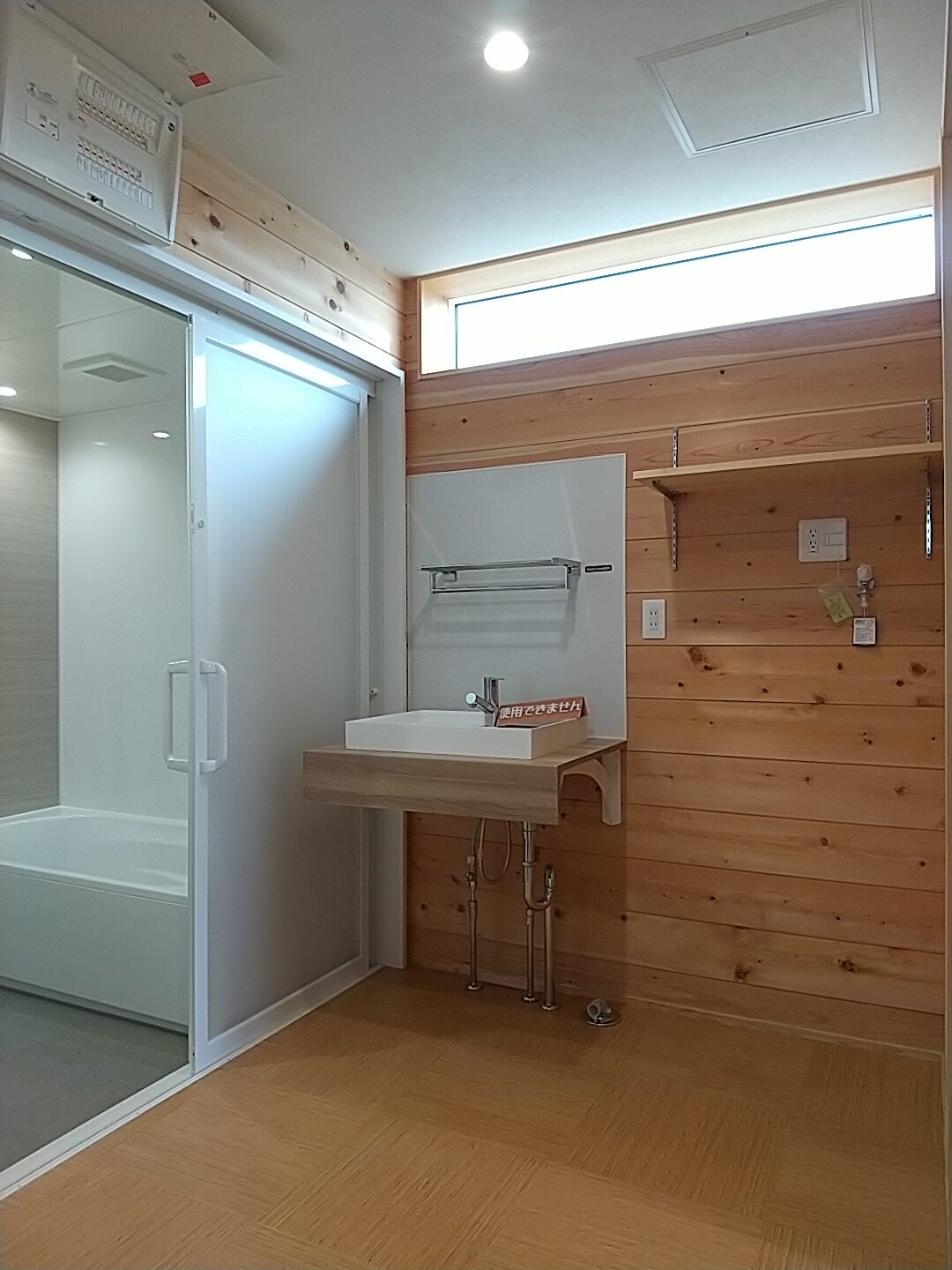 玄関左手に進むと、洗面トイレのスペース。帰ってきてすぐに手洗いうがい、顔も洗えてさっぱりできますね👍北側出入りのお宅は計画しやすい間取りです。その並びに脱衣と浴室。