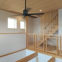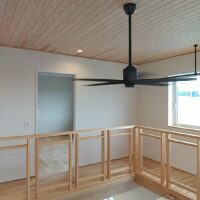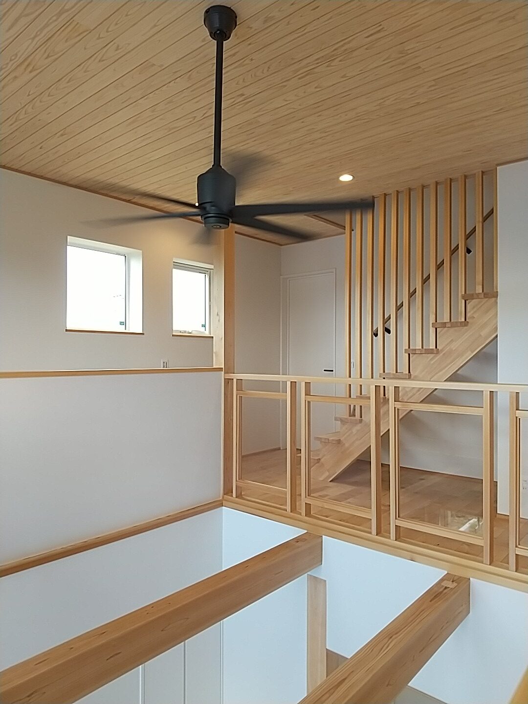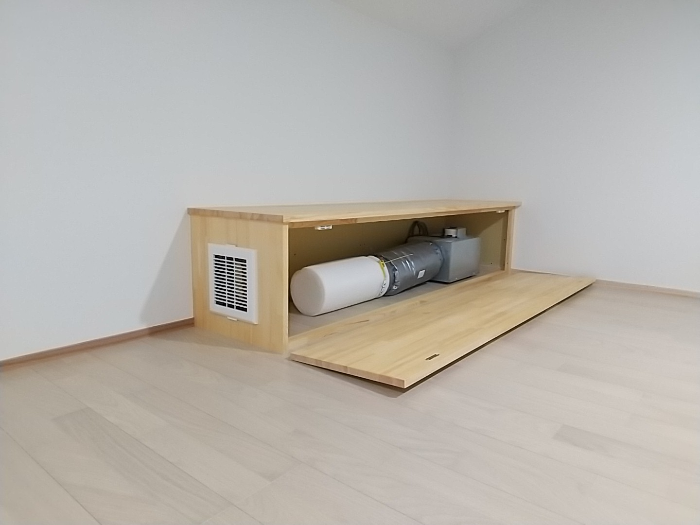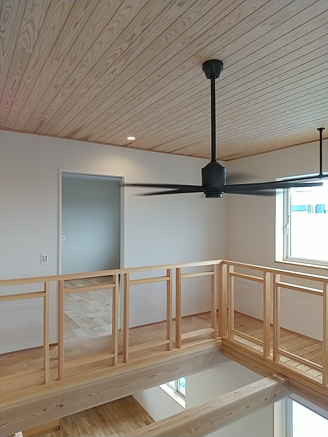 小屋裏には、採用されている熱交換システムのオプションで小屋裏の空気を床下に送り込むファンが設置されています。手動運転もできまずが、温度を感知して小屋裏の温度が高くなると動いて、床下に空気を送り込むことで、下階からの冷気を小屋裏にまで循環してくれます。吹抜けに設けているシーリングファンと同じような役目をしてくれます。涼しくなったとは言え、高断熱高気密ではない家では小屋裏は暑くて居られない場所ですが、ご来場いただいた皆様、『小さいお子さんの部屋になるね~』なんて言われるくらいの快適さでした。