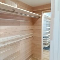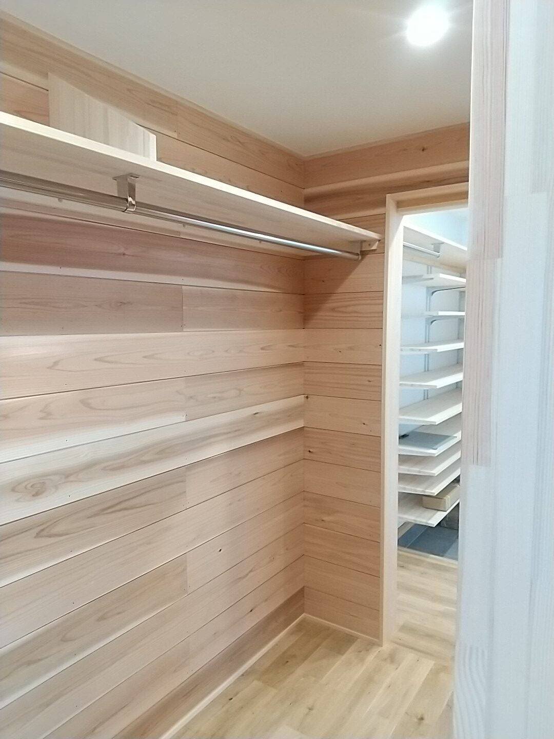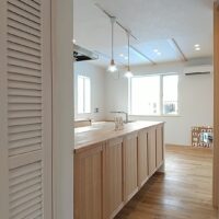 脱衣室は、廊下以外にパントリーを通ってキッチンへも繋がっています。日中使わない脱衣室は、洗濯物干し兼食材搬入の通路。大忙しの夜は、食事の用意をしながら洗濯物を回すので、キッチンと繋がっているととても便利。家事超最短動線です。