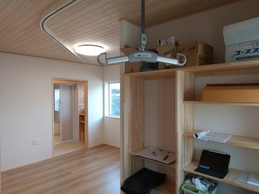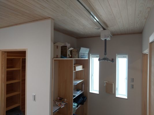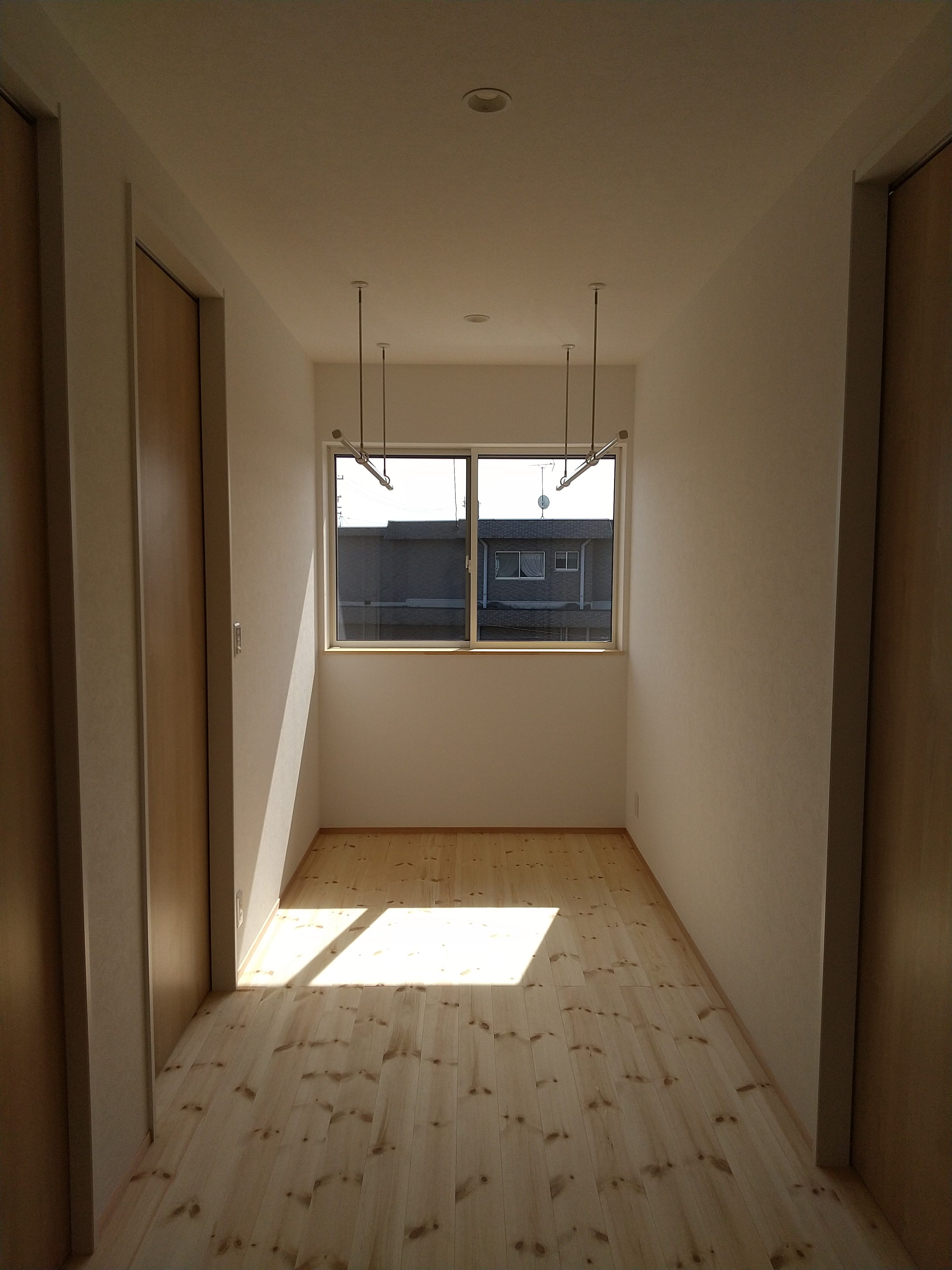 そして「されど物干しスペース」がgm様邸の2階共用部分の廊下にもあります。最近は、2階建てでもバルコニーを付ける方が少なく、部屋干しスペースを確保される方が多くなってきています。天気を気にせずに干したまま外出できますし、花粉も付かないので、何とか作りたいスペースです。