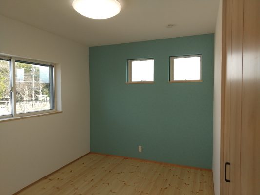 こちらは、2階の奥様の寝室。アクセントに大好きなティファニーブルーを取り入れられたそうです。何かの色だなぁと思っていたら、そうでしたティファニー。心を落ち着かせてくれる青色と、癒しをもたらす緑色が入った、青緑色。リラックスできる空間になりそうですね。