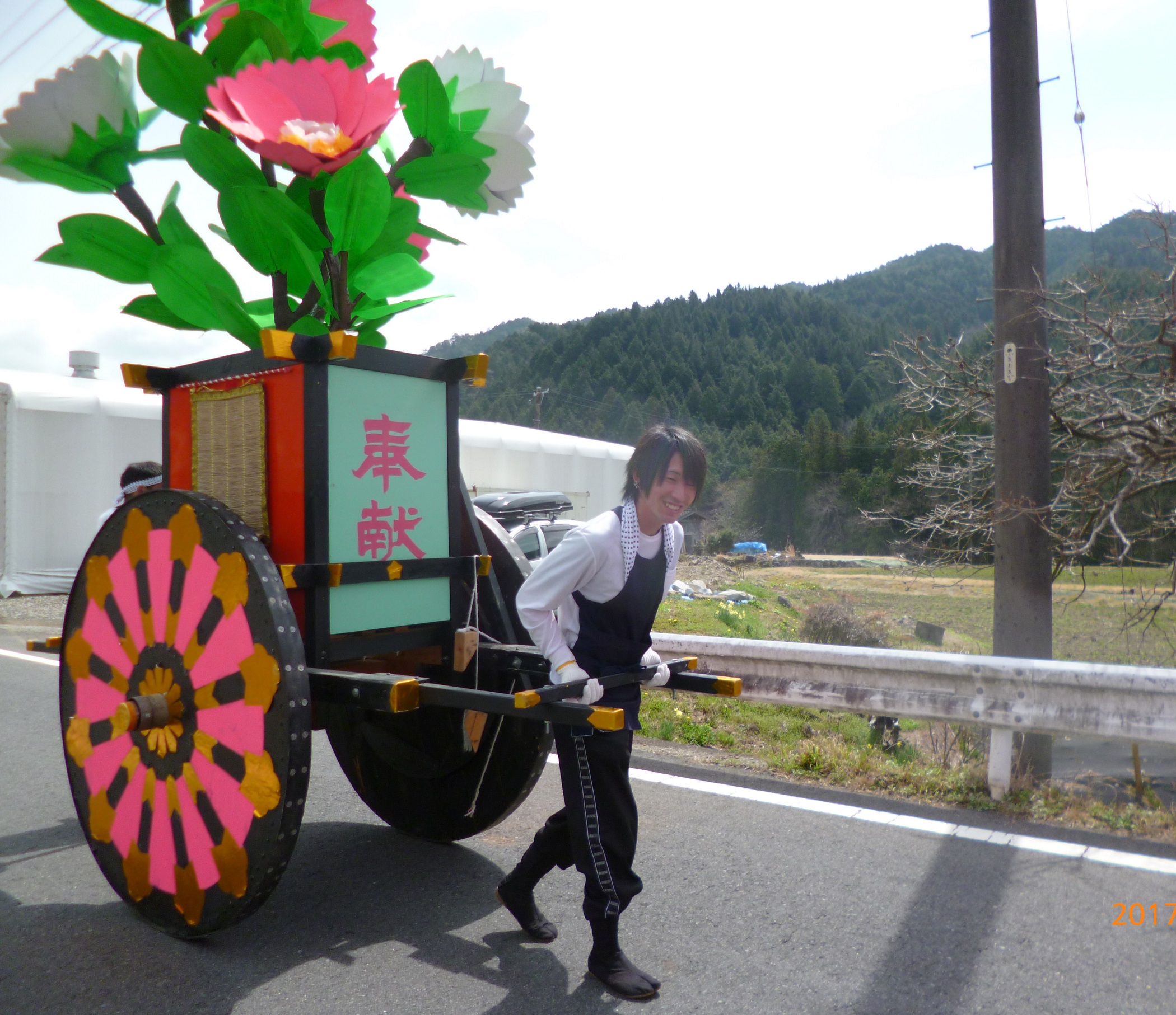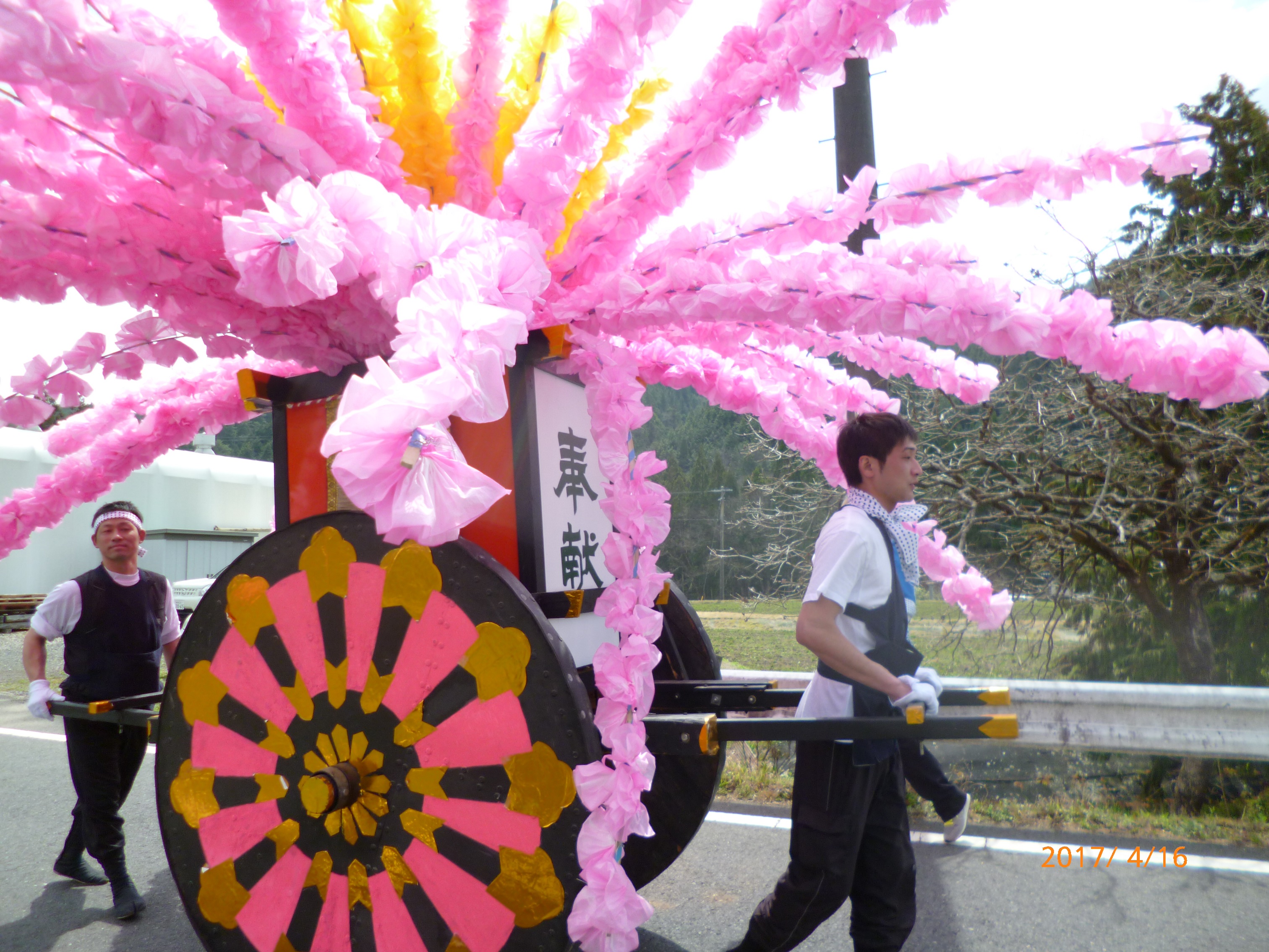 今日は佐久良田神社の春祭り、御所車,山車、踊り子さん、お囃子すべて地元総出の手作りです