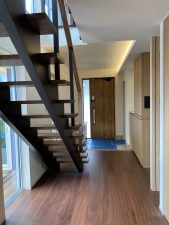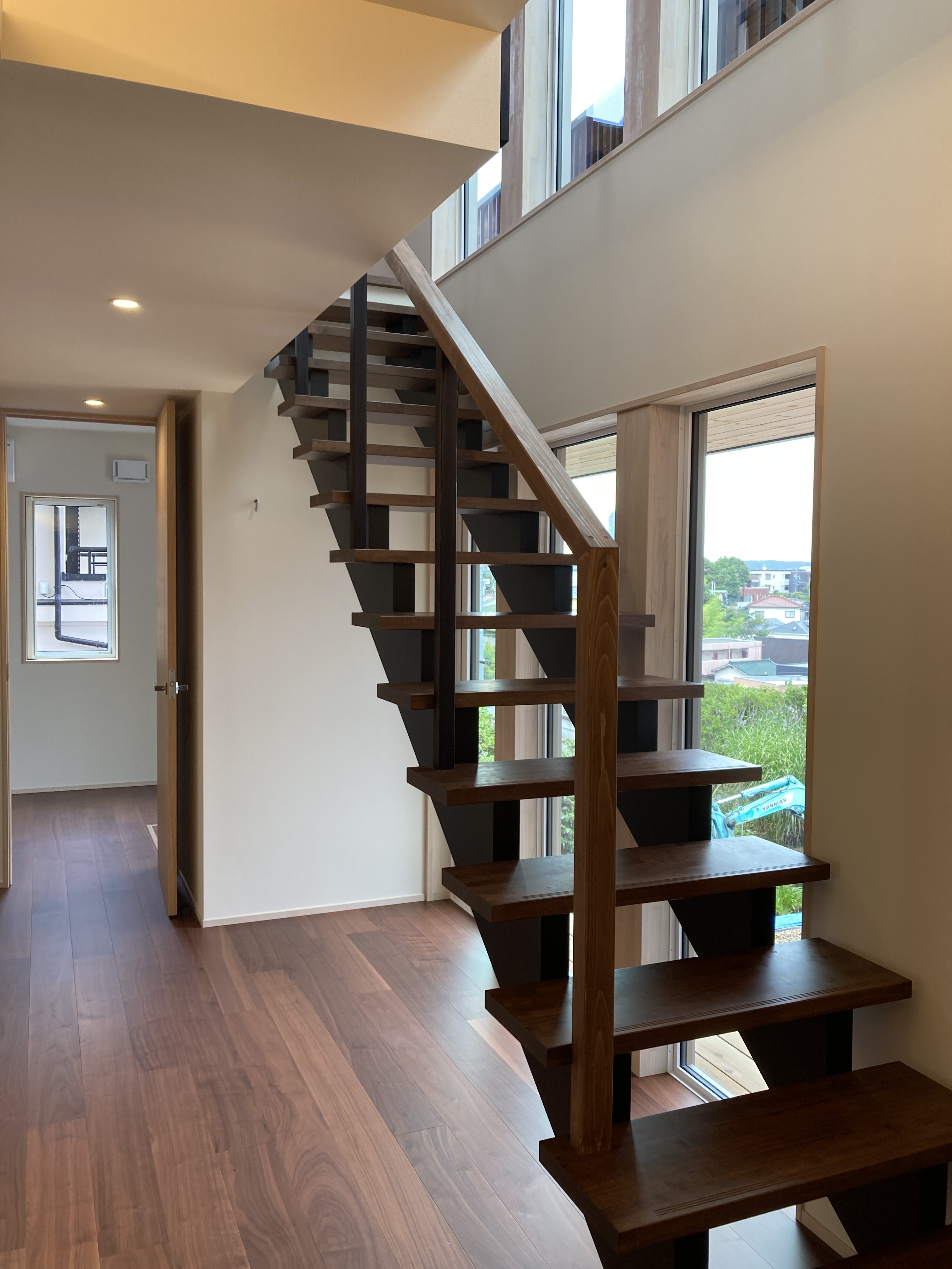 1階は玄関を入ると、目を引くストリップ階段。ストリップなので視界を遮らない為、南側の窓開口が大きく取って、明るく開放的な廊下になっています。廊下や階段がただ通るだけの空間ではないのがいいですね。冬はここから日射も取得できるので、北側にしか面することが出来なかった部屋へも、暖かい空気が回ると思います👍