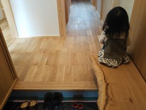 親世帯の平屋は、玄関を開けると桧の爽やかないい香り。玄関~廊下、LDも和室と同じく真壁で構造材の桧の柱が見えた和風造りです。