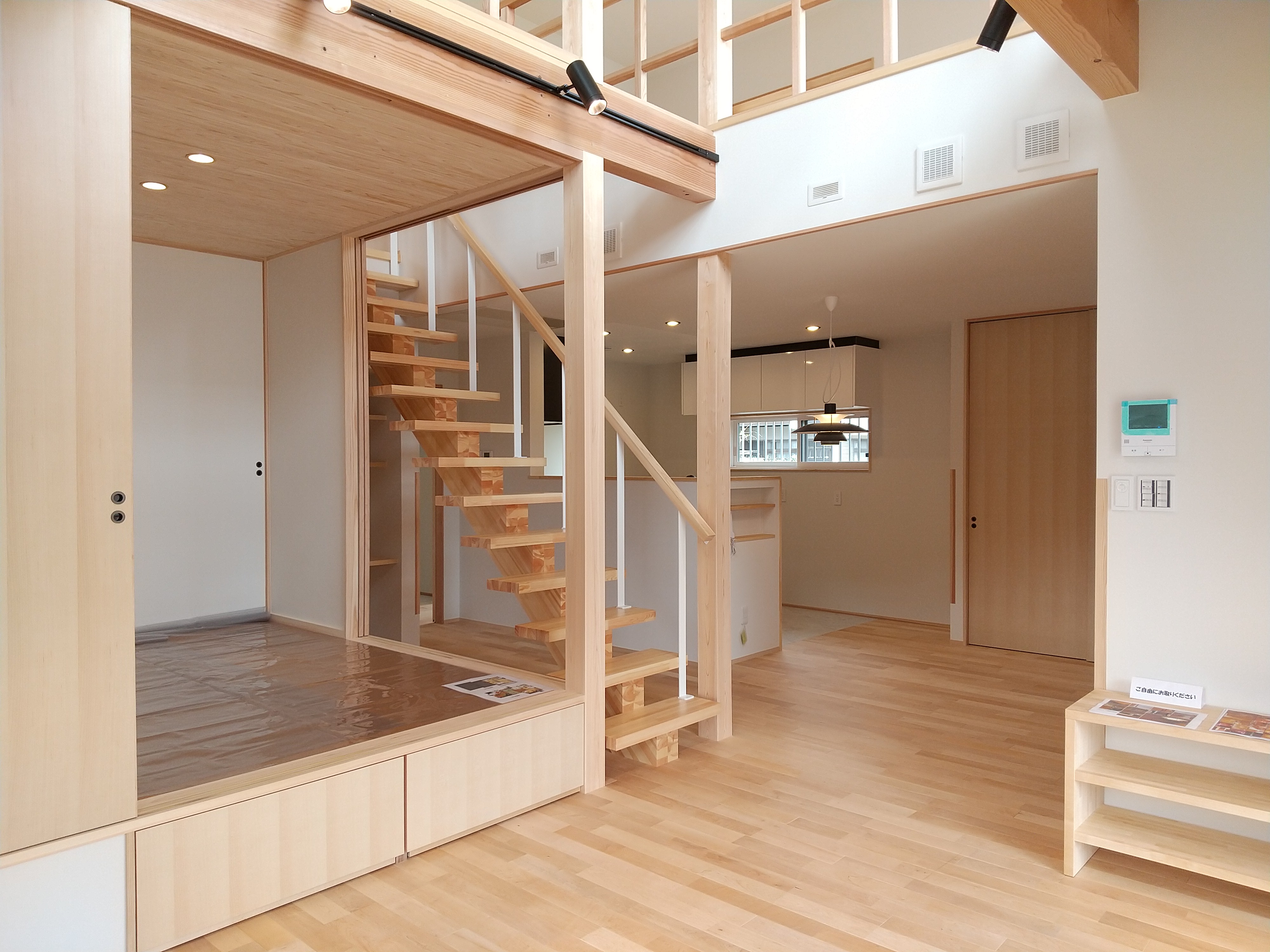 息子さん世帯は、玄関の引き戸を開けると、吹き抜け空間があるLDK。どちらかと言うと脇役の階段がオシャレな出で立ちで家の中央に計画され、この家の主人公になっています。2階の吹き抜けに面した部分は、吹き抜けを中心に回廊の様に将来間仕切りを設ける事が出来るようになっています。