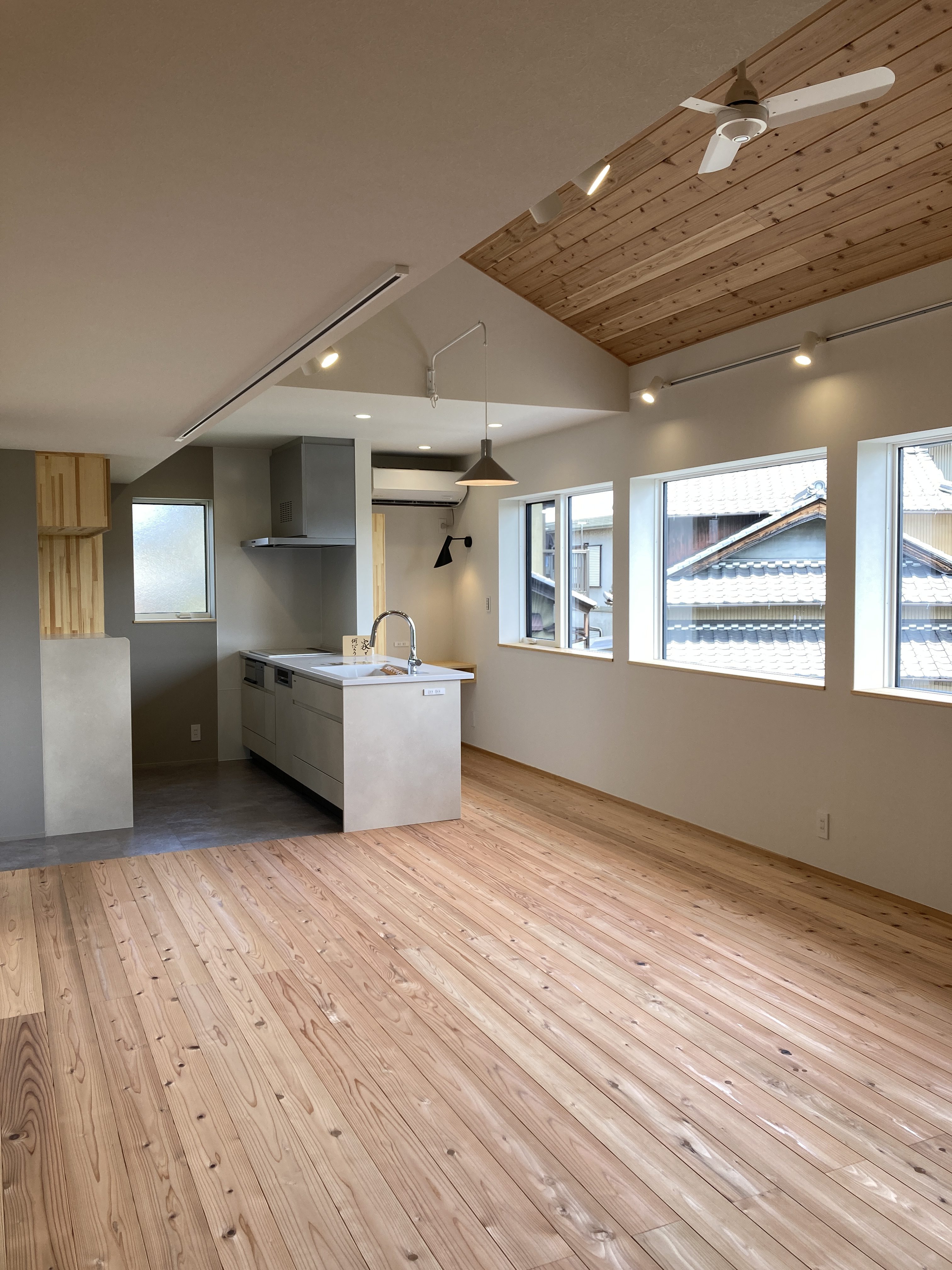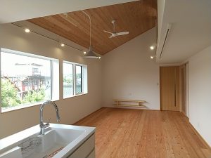 2階LDKは南に面して計画され、冬の日射取得を考慮して大きめの窓が3つ並んでいます。約18畳の比較的コンパクトなLDKですが、勾配天井とこの3つの窓の効果で、空間が広く感じます。