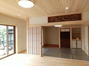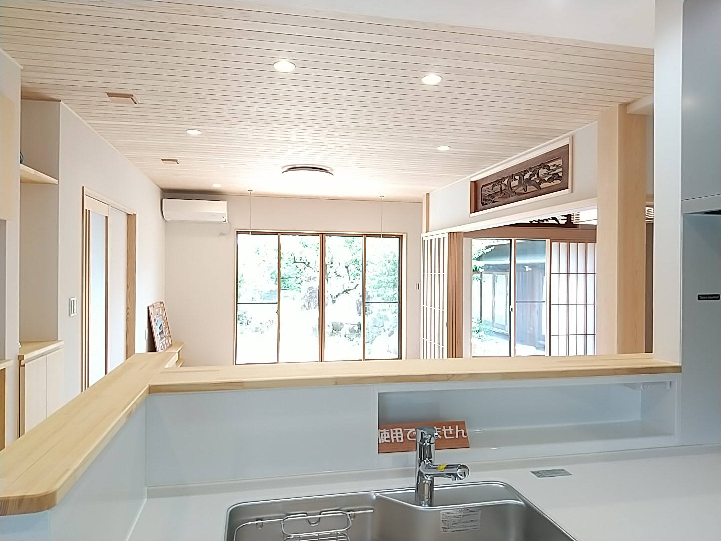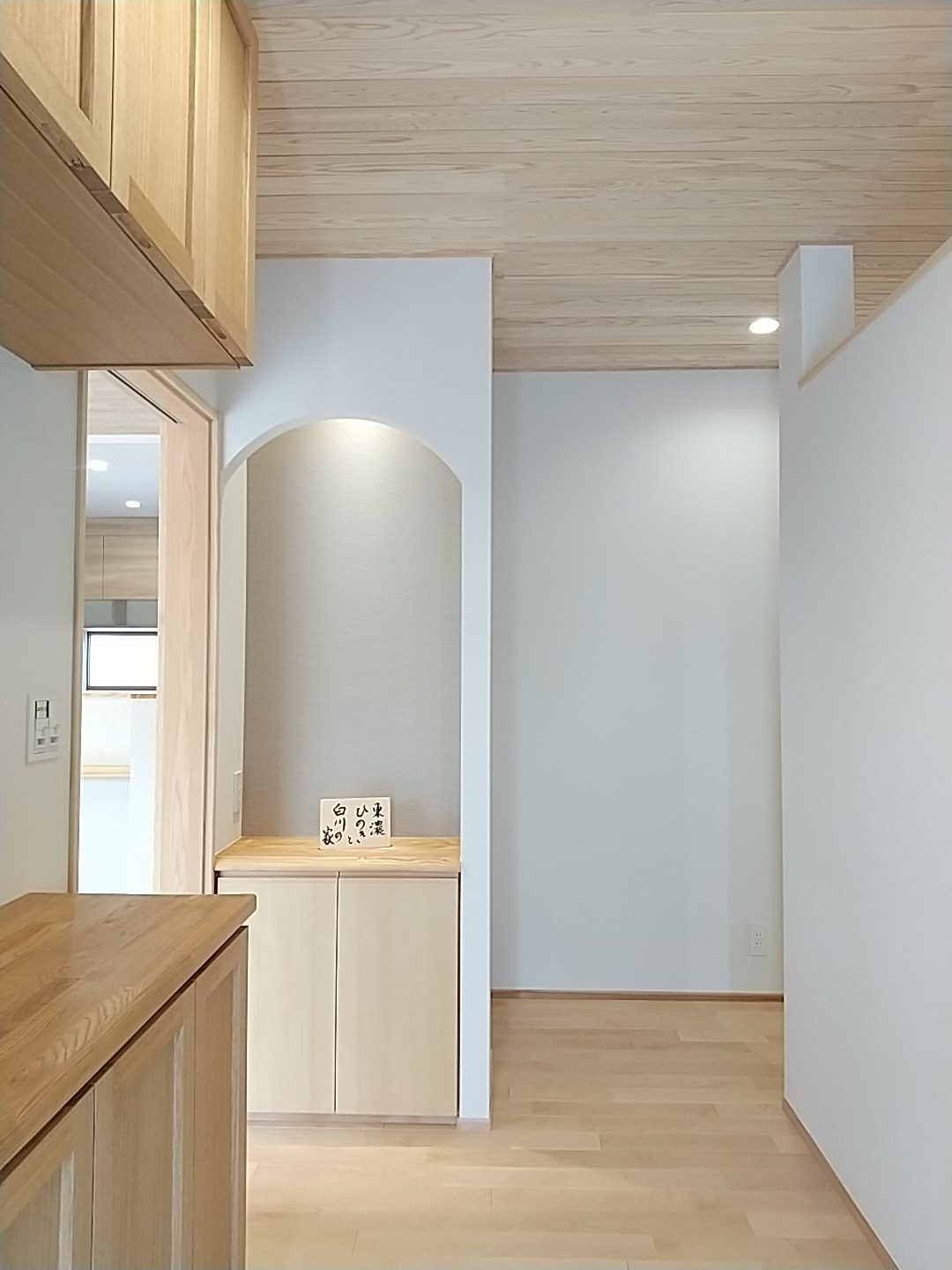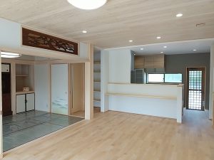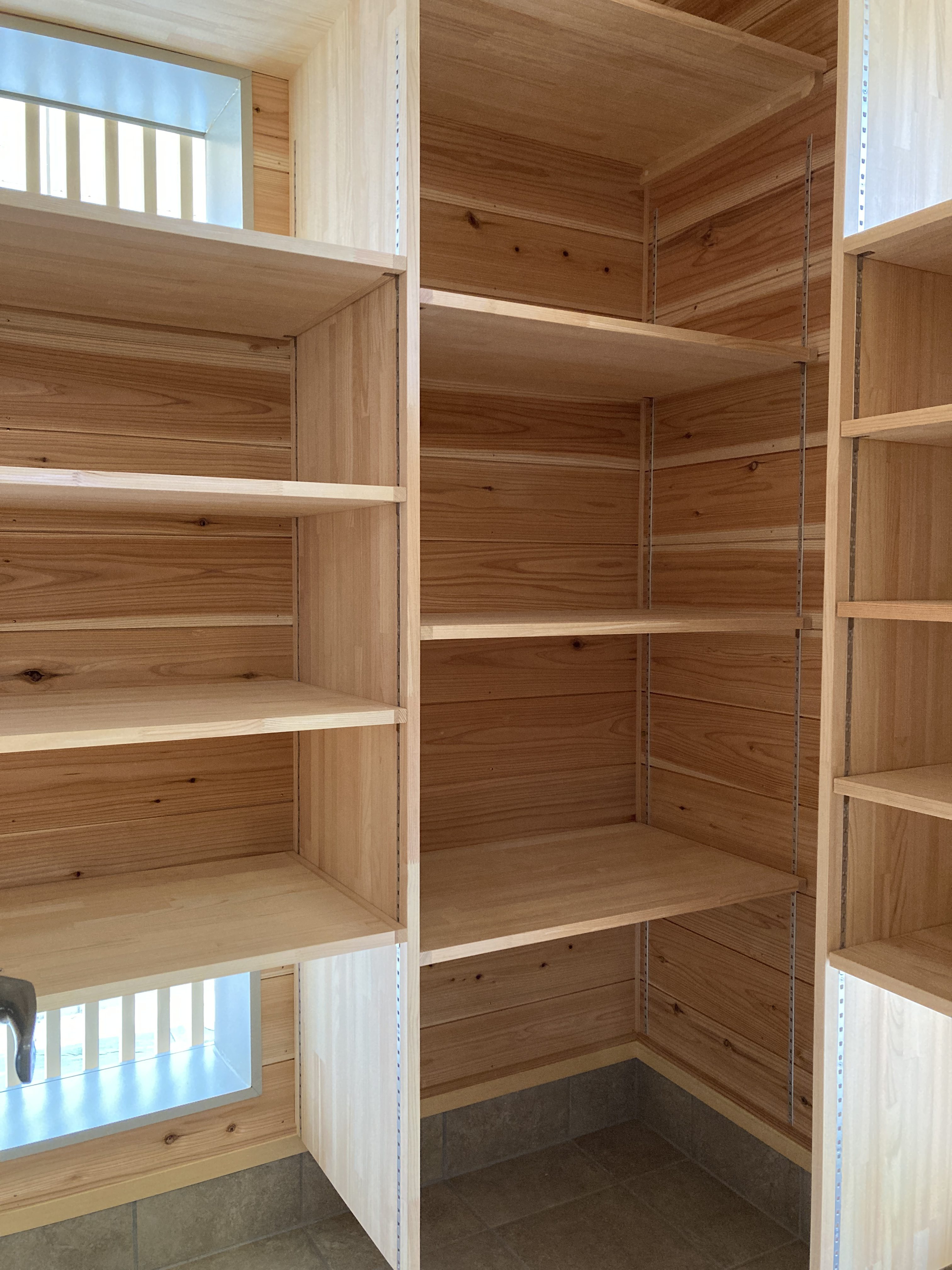 1階LDKは、和室と繋がる間取りで明るく広々とした空間です。キッチン横には、高気密高断熱住宅の弱点💦常温保存している野菜が室内が暖かくて腐りやすい事を解消するために、一部外気を取り入れたパントリーを設けられました。畑をやられている方は特に、この様なスペースは熱的境界線をどこにされるかもご検討されると良いですね。