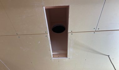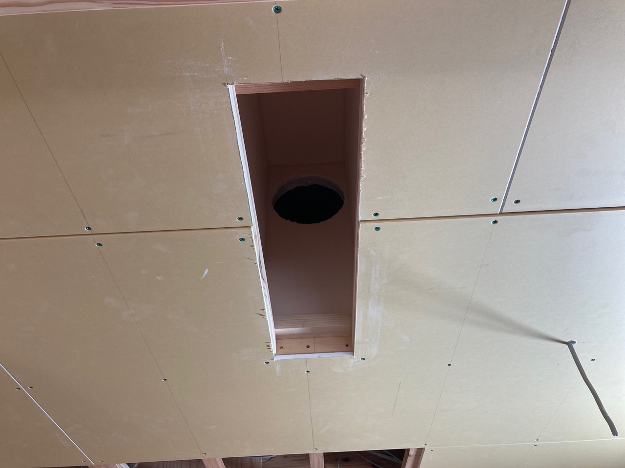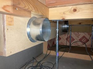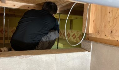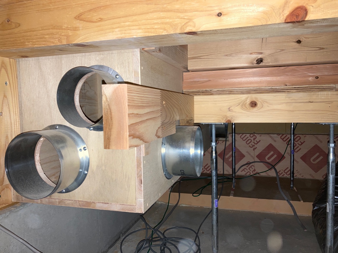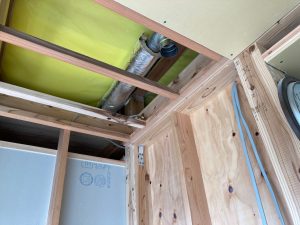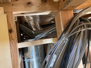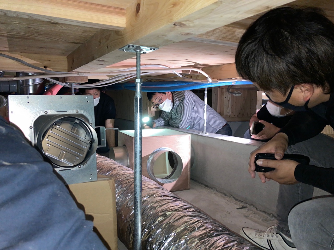 床下にはk長先生の理論の肝となる熱交換器、換気扇、ダクト、エアコンなどの設備が満載。既製品には無く必要な部材は合板と断熱材を組み合わせて造られています。これだけのボリュームの仕事をするにはやっぱり床下有効高さはこれくらいあるとありがたいです。