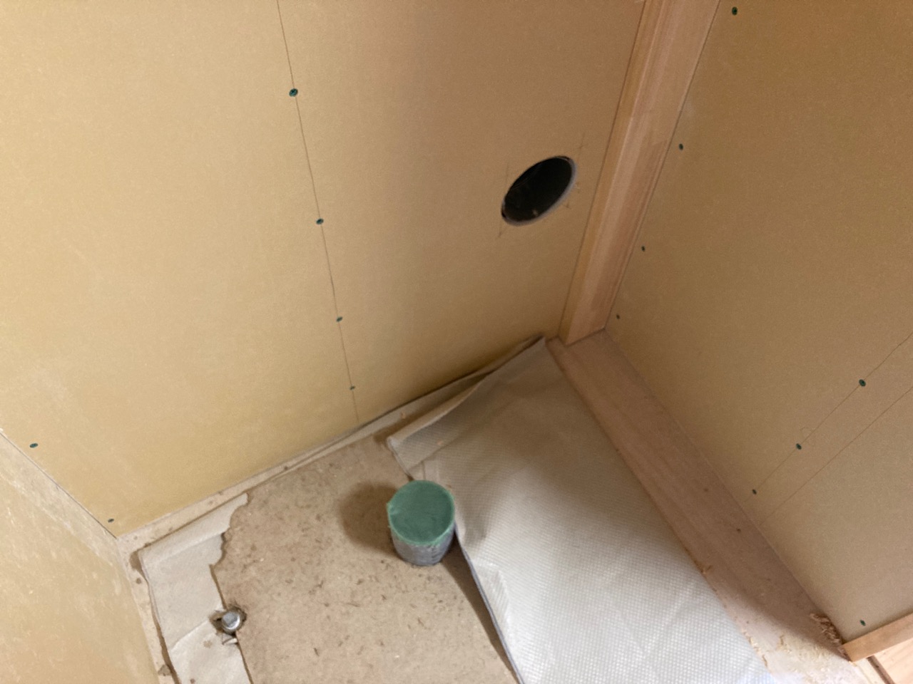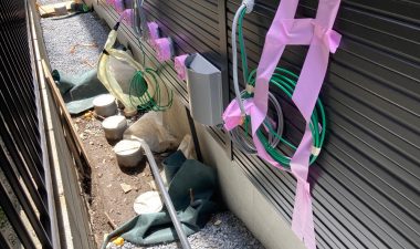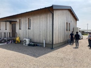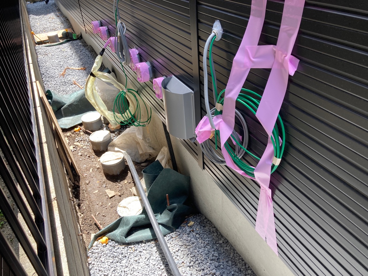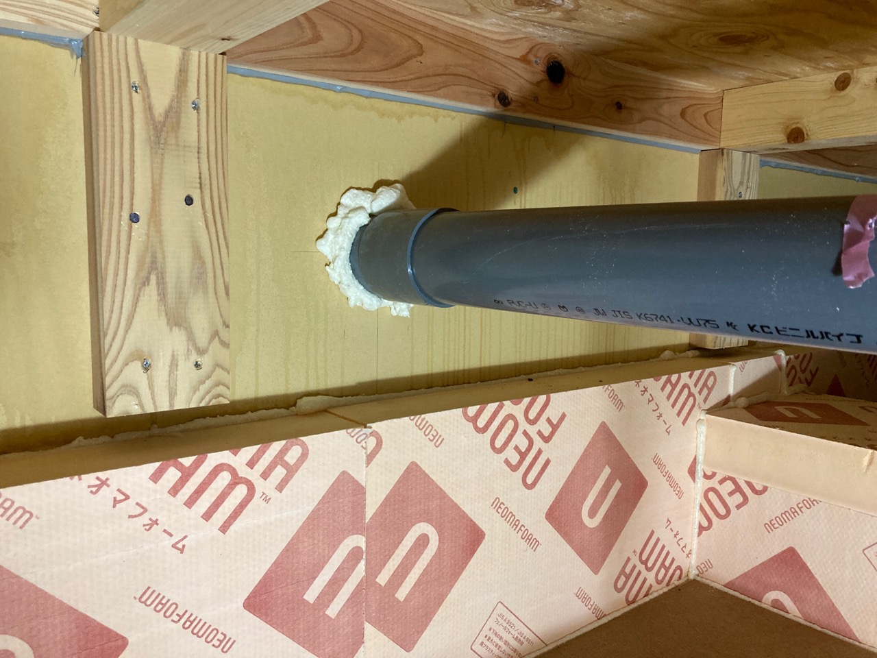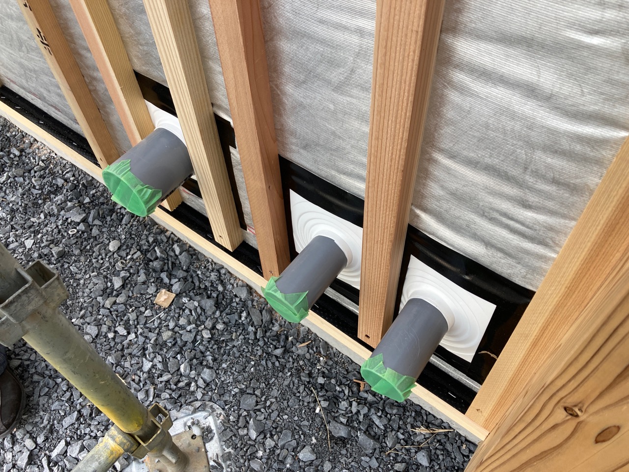 外周を見学していると作業中の設備業者さんが『この中に水道屋さんはおるかね?』と。このような計画では給排水管の壁抜き位置は比較的厳密に決められてくるので、狭小地など先行して敷地配管をする際には地中の桝の位置と被らないように注意しなさいと教えていただきました。