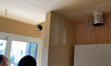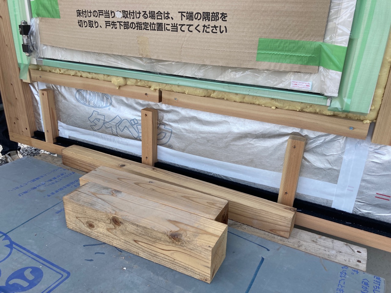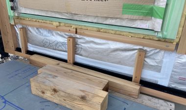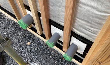 2軒目の現場にお邪魔しました。まずは外部周りから拝見しましたがこのk長先生、室内の温熱環境だけでなく外壁の防水に対する監理も徹底しておられ、特にサッシ周り、配管周りの防水の考え方には舌を巻きます。