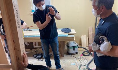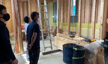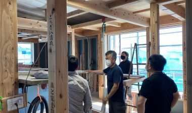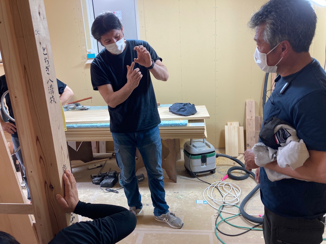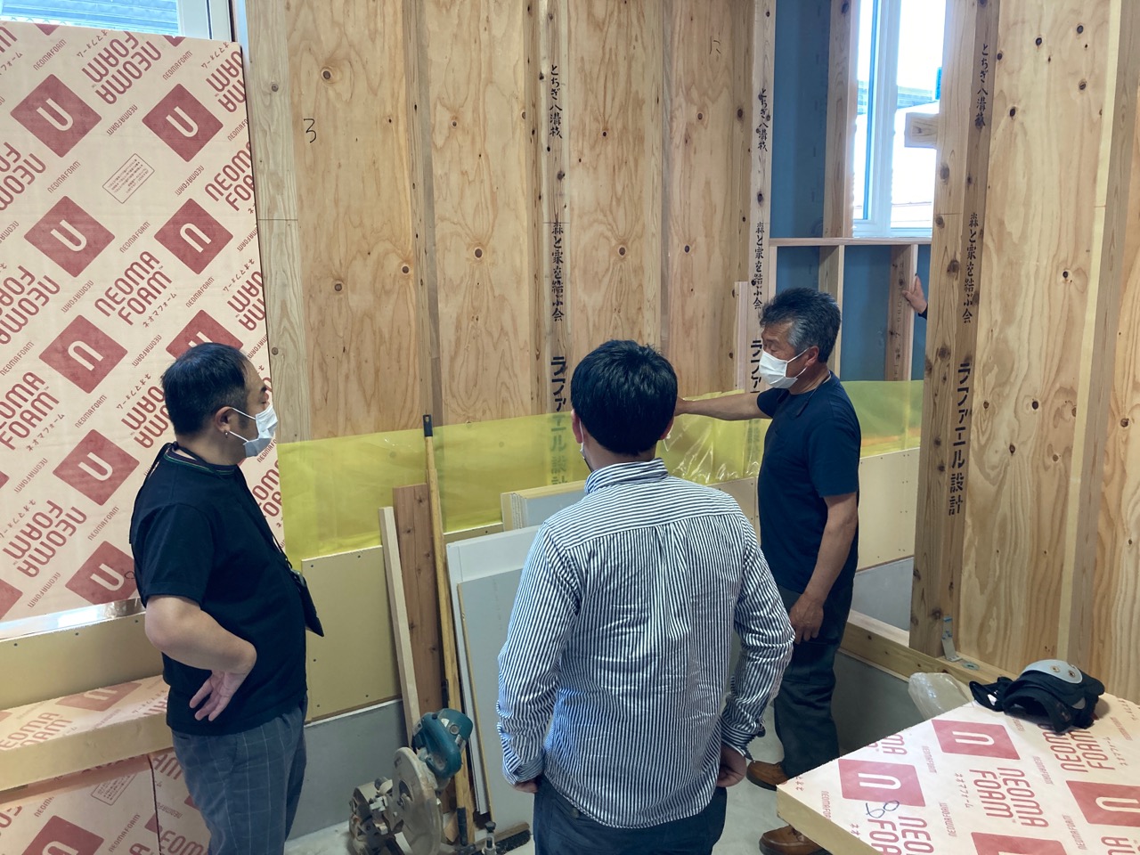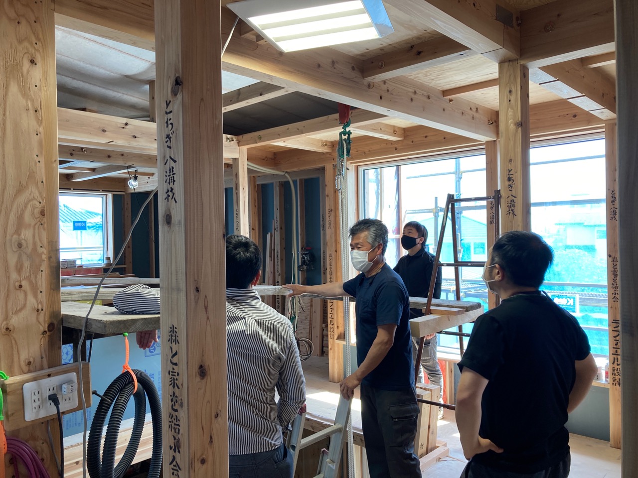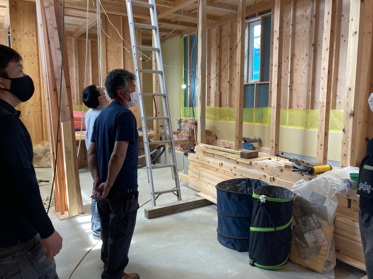そしてこの現場を担当する大工棟梁の、こちらもw辺さん(右写真中央)。社長、s水はk長先生と設備の話で、w辺棟梁同士は材料や収め方の話で非常に盛り上がっております。