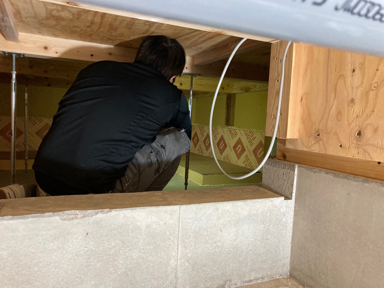 床下に潜らせてもらいました。r設計さんの計画はGL~1FLまでがおよそ90㎝。一般的な工務店では50~60㎝くらいのところが多いのですが、これだけ高さを上げるメリットとして、床下点検がしやすい事、床下に設備を格納するので配管が容易な事、人通口を設けないので布基礎(基礎梁)を分断する必要が無く耐力に優れる事、同じく配管が布基礎を貫通しないので耐力に優れる事、施主様が収納としても使える事、が挙げられます。