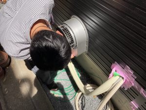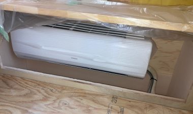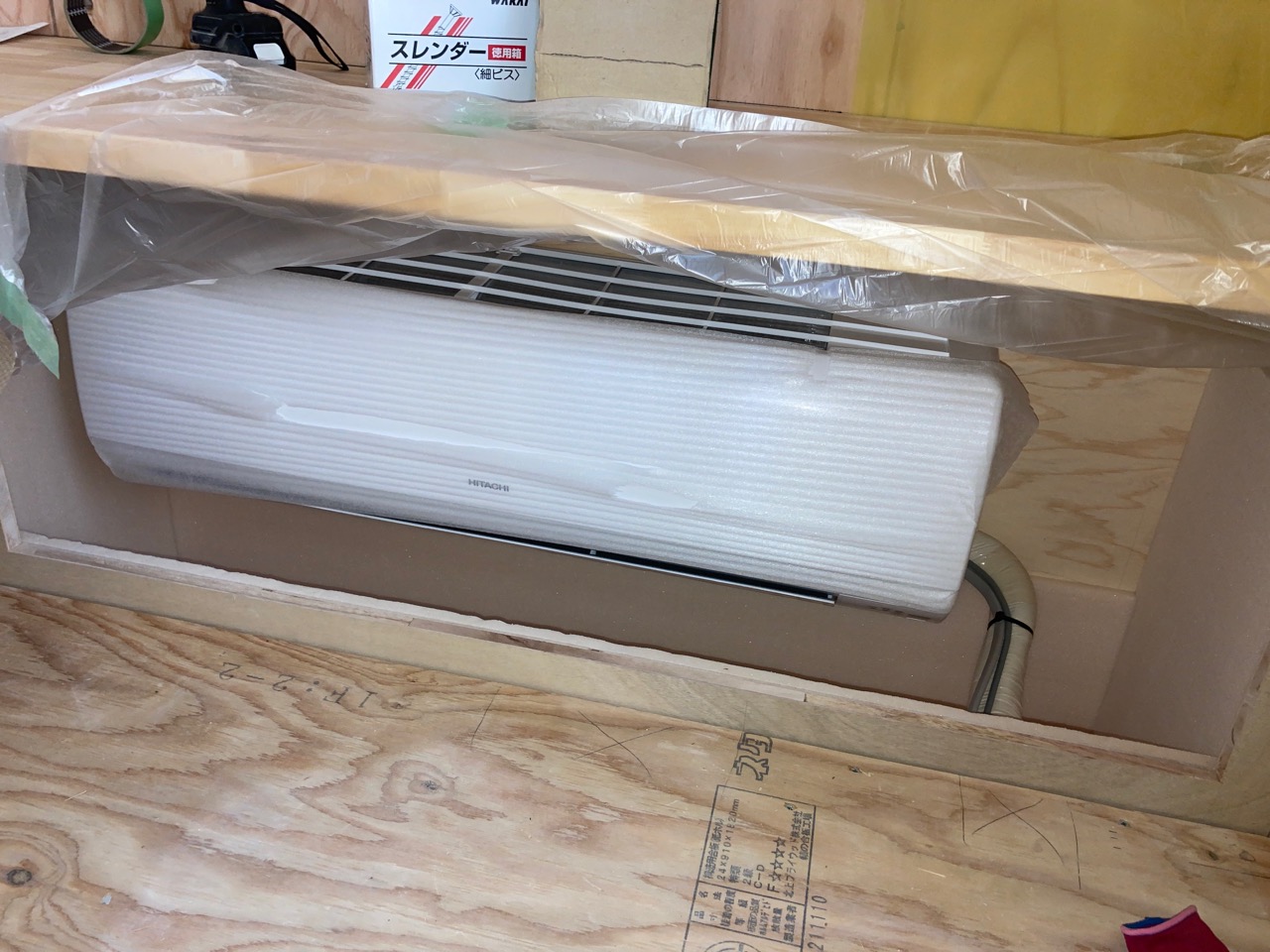 玄関ベンチの下に格納されていたエアコンと床下から格納庫を見たところ。普通の壁掛けエアコンが居室でもない玄関のしかも箱の中に格納されている。この状況で約40坪からの住宅の全体がほとんど温度差なく快適に暮らせると聞くと、理論を知らない立場の人からして『そんな眉唾な』という気持ちになるのも分からないでもありません。