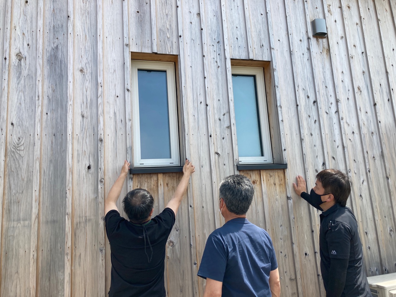 この杉外壁は無塗装仕上ですが、お客様が経年変化を楽しみたい方らしく『早くお寺のような色になってほしい』との事だそうです。