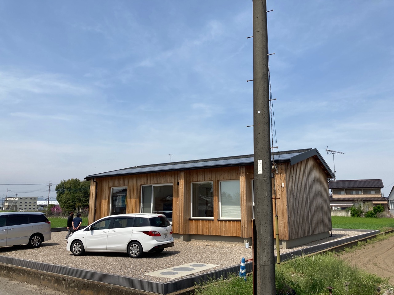急遽、隣町にある現場をもう二つ見せていただける事になり、その一軒目を訪ねました。すでに昨年お引渡しをされているところですので、こちらは外部のみ拝見しました。杉板の押縁工法でされた外壁仕上、その際に行う防水の注意点などうかがいました。押縁工法は筆者も非常にやってみたい仕上なのですが既製品の外壁材と違い、防水仕様やメンテナンスなど、採用するには非常に勇気のいる仕上です。