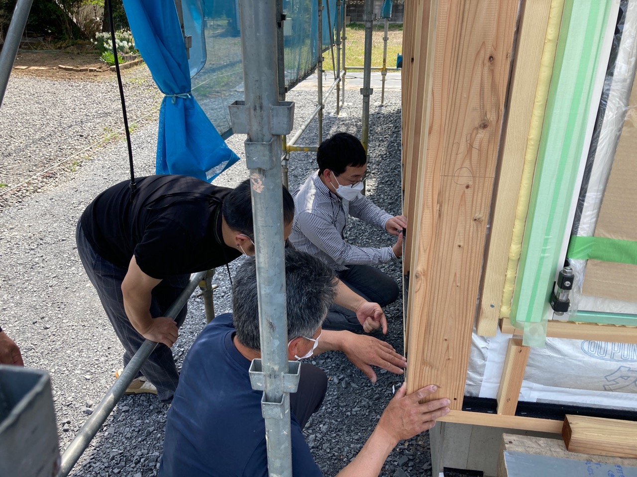 翌朝、早速施工中の現場を拝見にあがりました。ミノワも加入する『新住協』、そのご縁で知り合った宇都宮市の『r設計』主宰のk長先生(左写真右から2人目)です。現在ミノワで検討中のお客様は愛知県の三河地方の方ですが、新住協を通じて全国の設計士さんの中からk長先生を探し当てられたとの事。まさしくその情熱たるや・・。