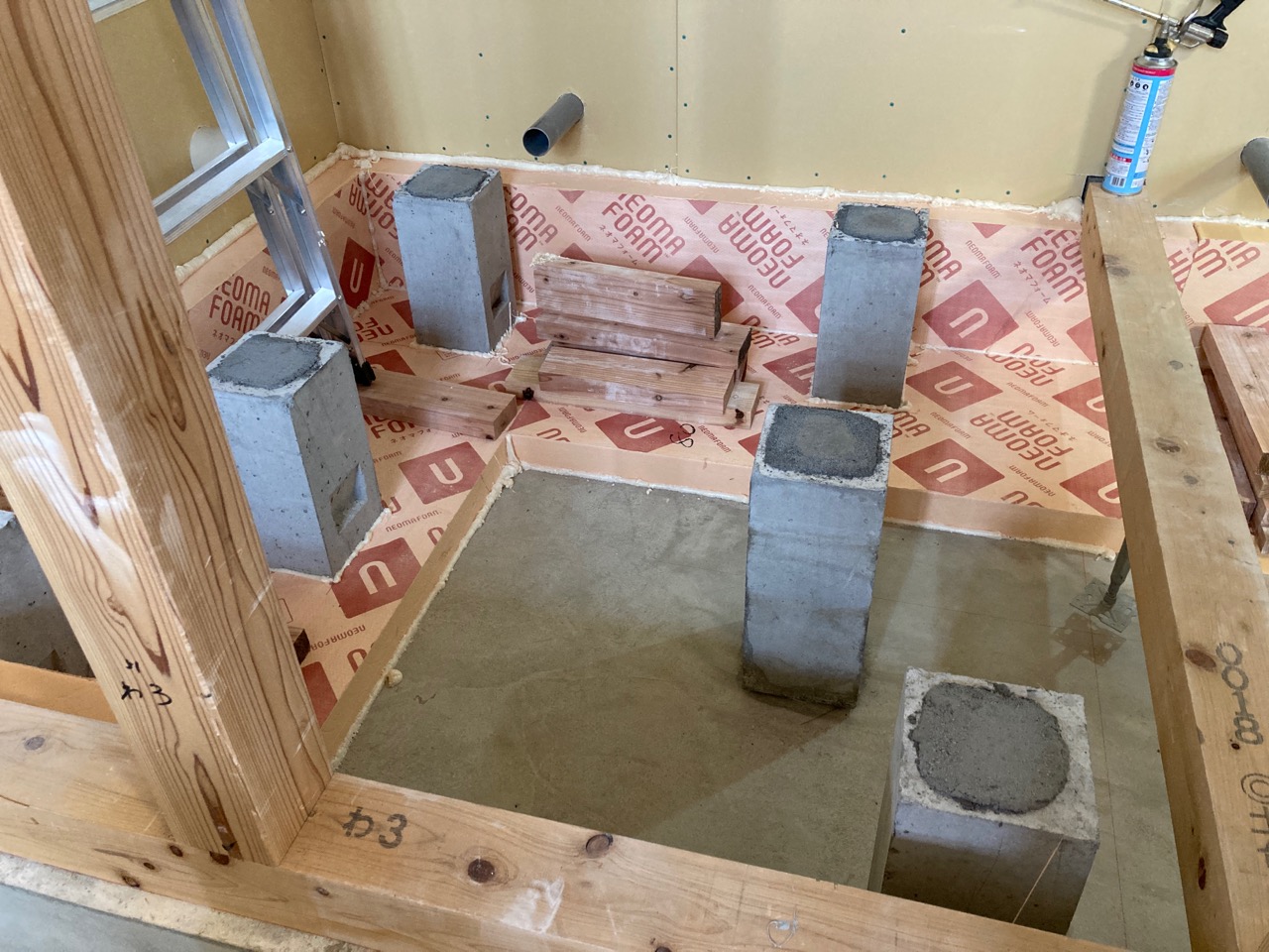 ユニットバス設置位置に立つストーンヘンジ。1階床高をここまで上げるという事はユニットバスも上げる事になります。逆にこれだけ高ければ点検が非常に楽です。