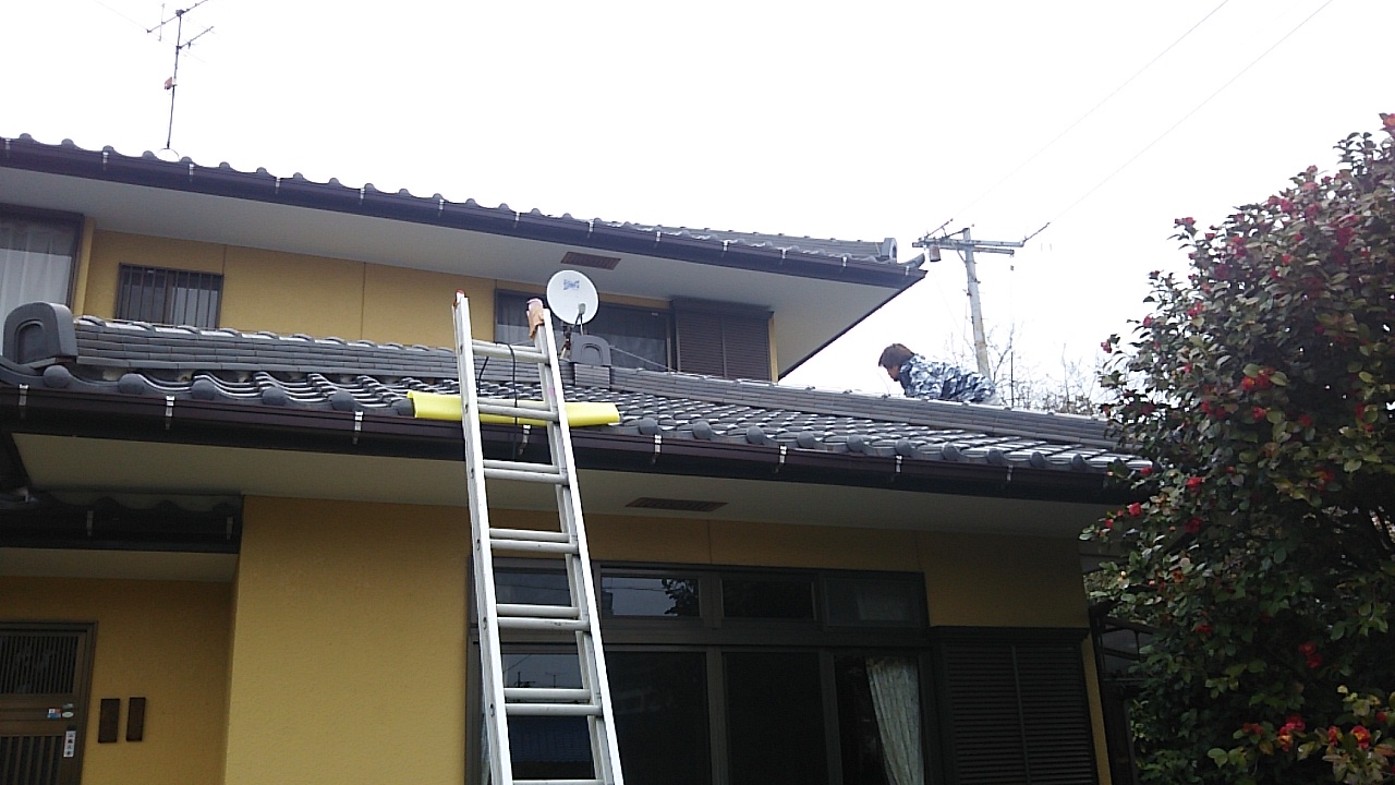 屋根瓦の漆喰が部分的に剥がれたりしている部分を点検補修しています。