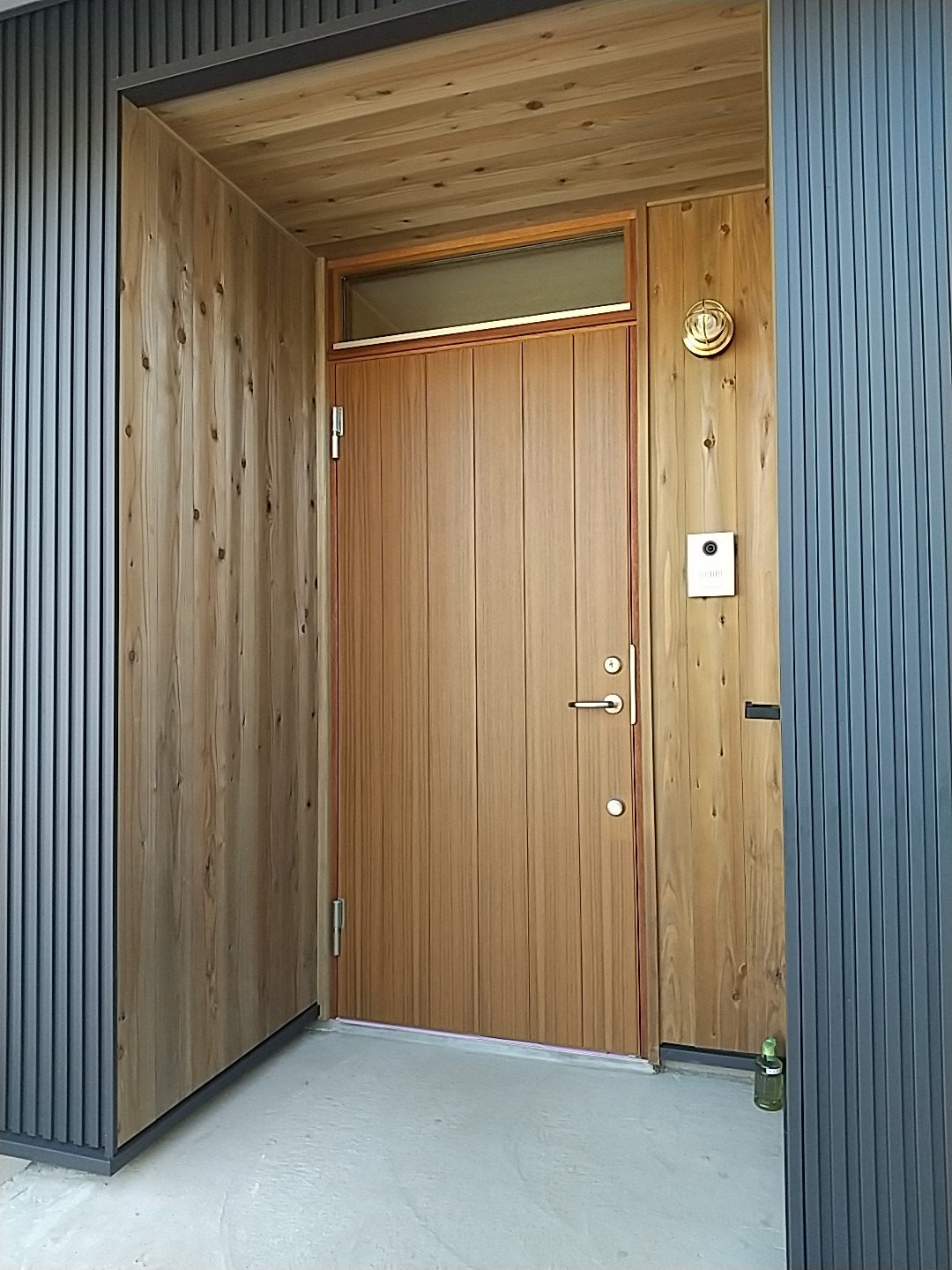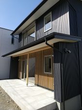 玄関は、木製ドア。外壁は全体的にガルバリウム鋼板ですが、アクセントに杉の板を張っています。