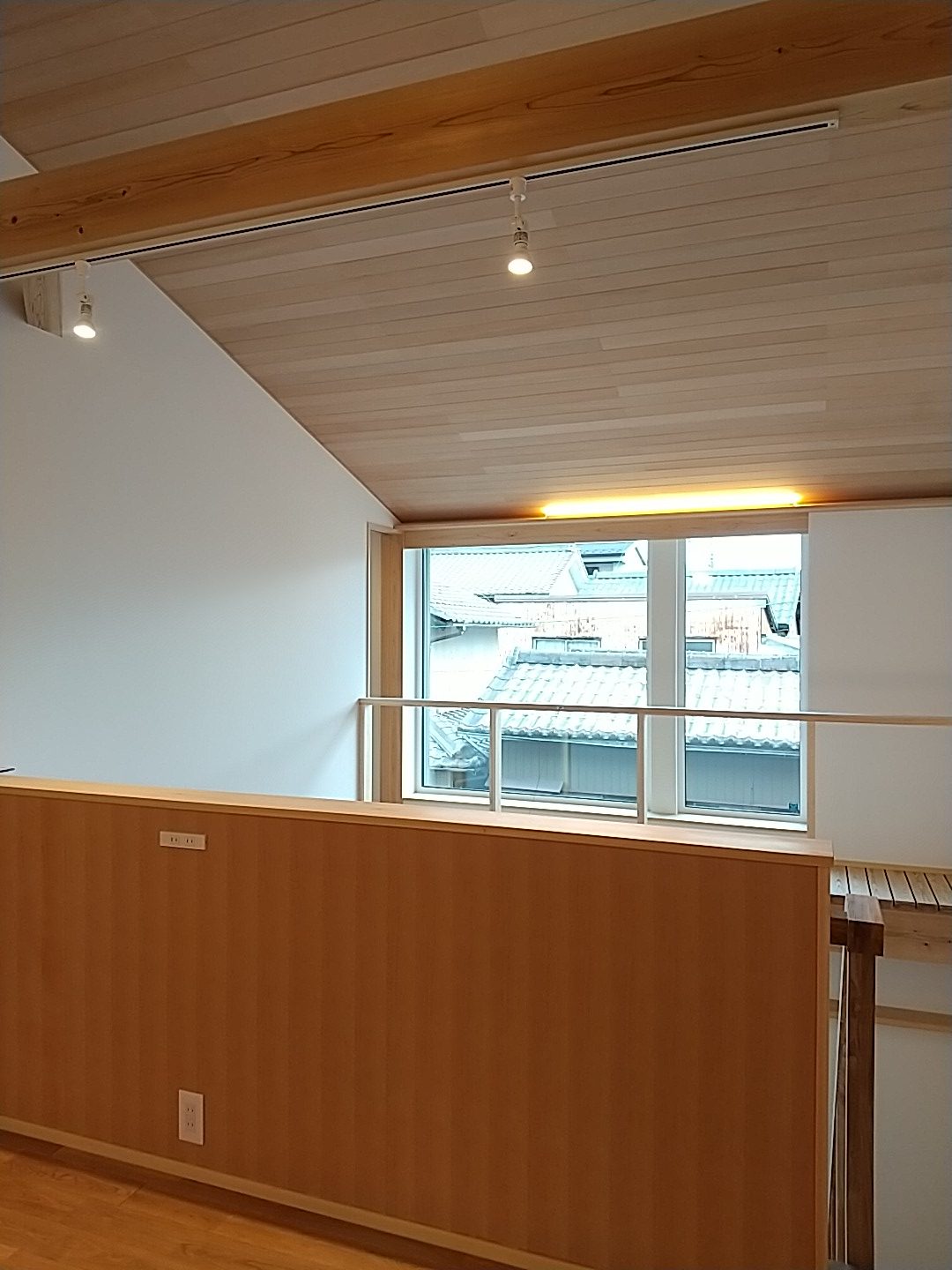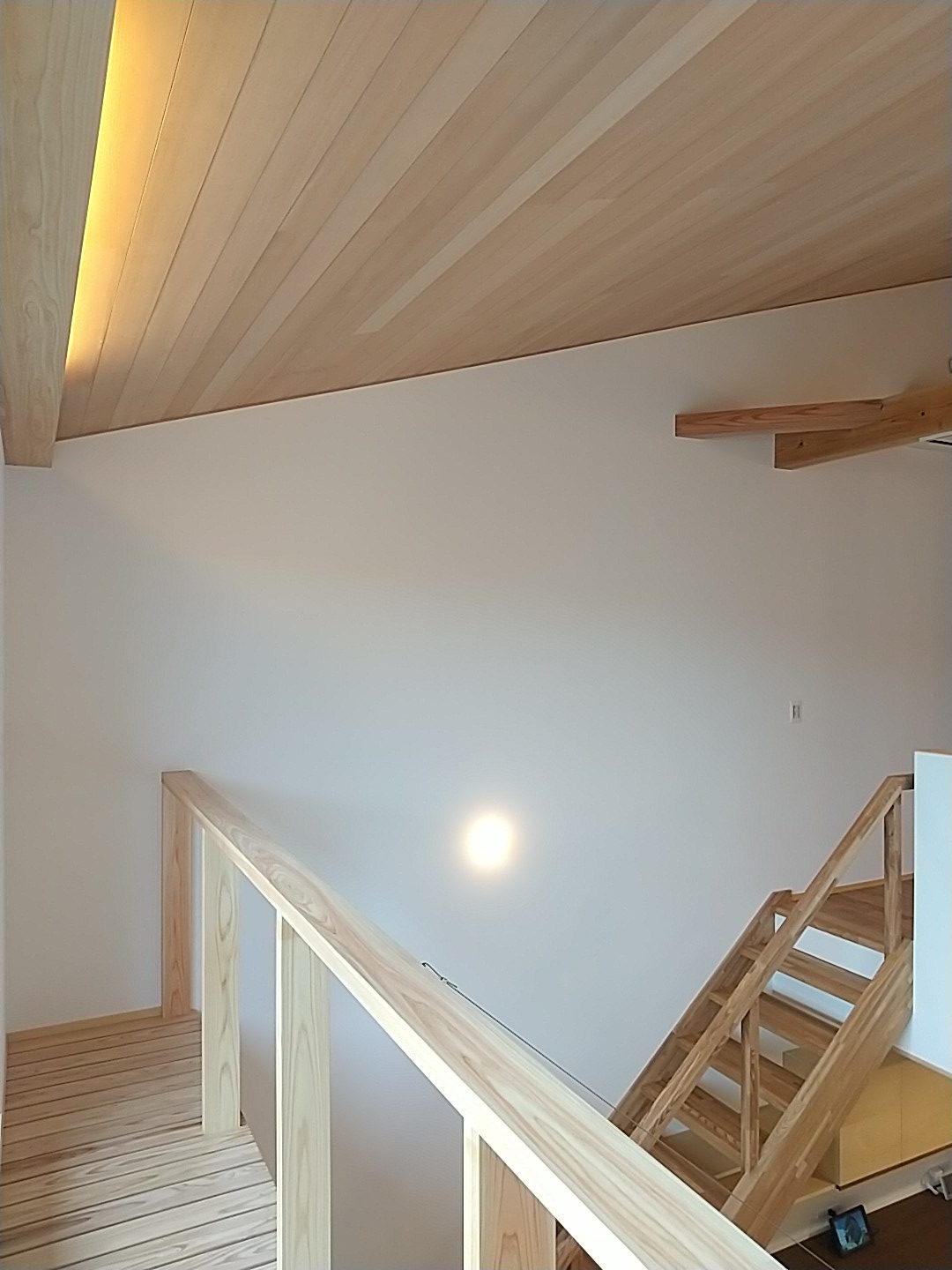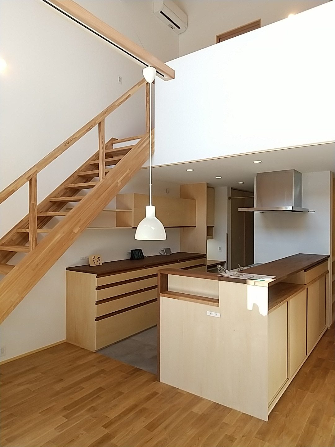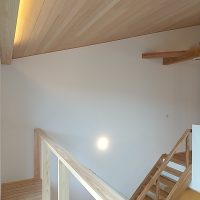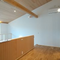 また2階ホールに冷房用のエアコンを設置しています。エアコンの容量は10畳用のエアコンで家中の冷房を賄える計算結果になっています👍高気密高断熱の家は、暖房エネルギーは自然温度差のお陰で随分少なくなり、暖房エネルギーよりも冷房エネルギーの方が多く必要になってきます。けれど、10畳用エアコンで、吹き抜けも含めると70帖を冷やす事ができるなんて~異次元ですよね。