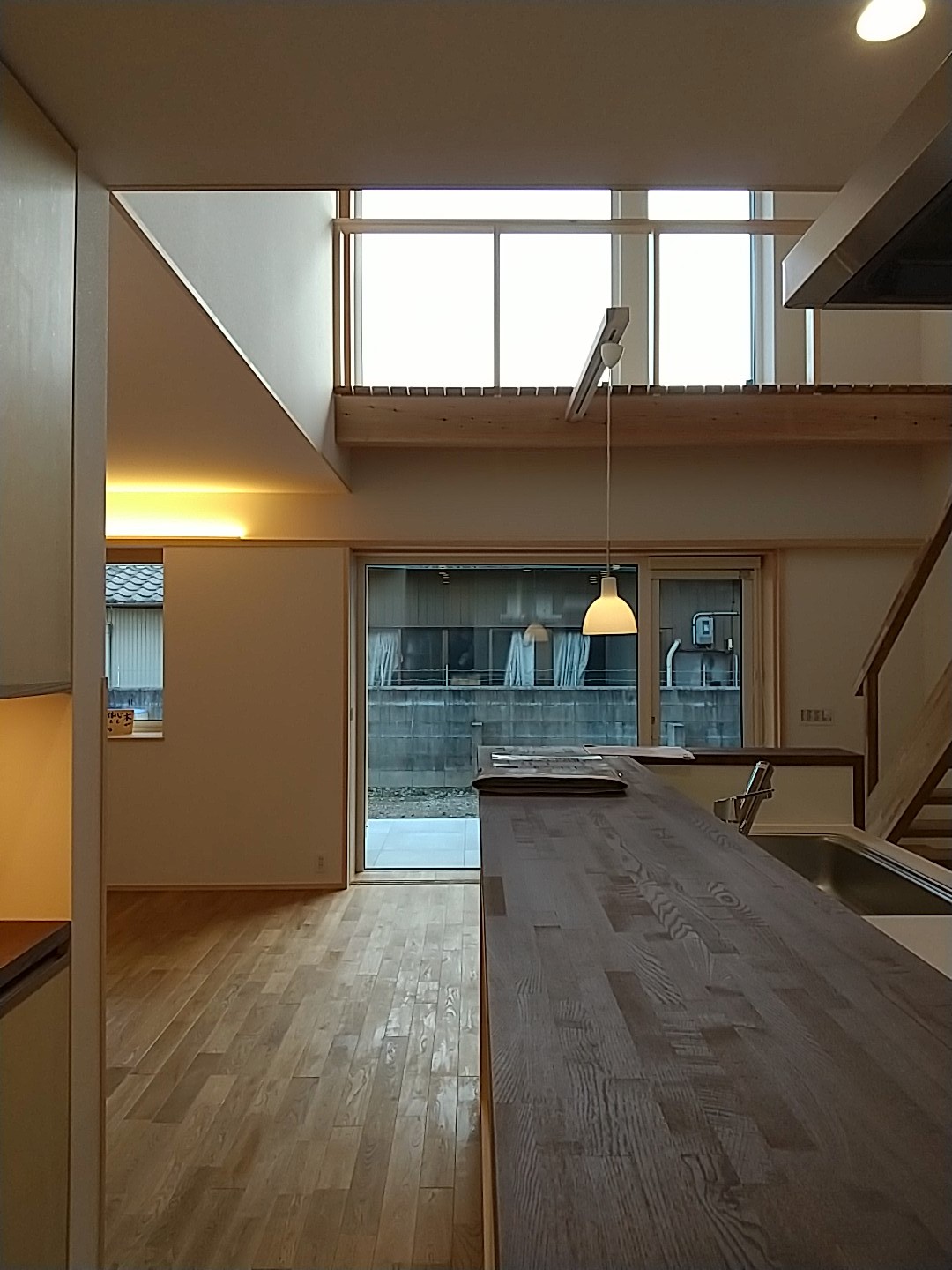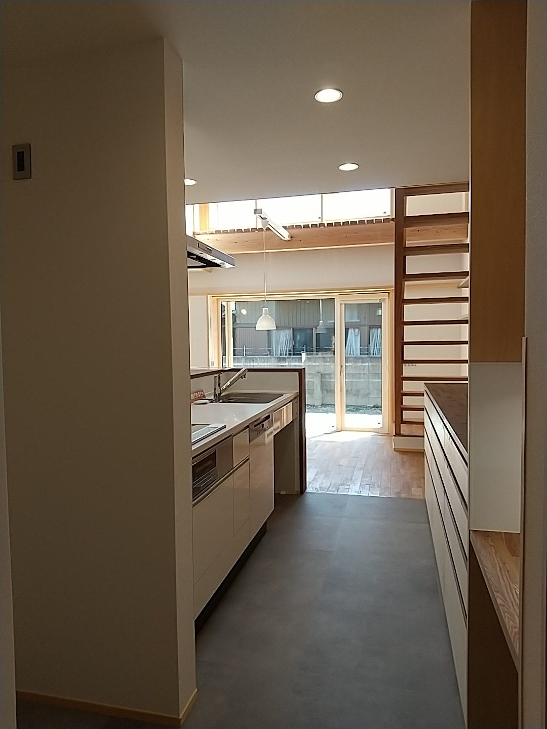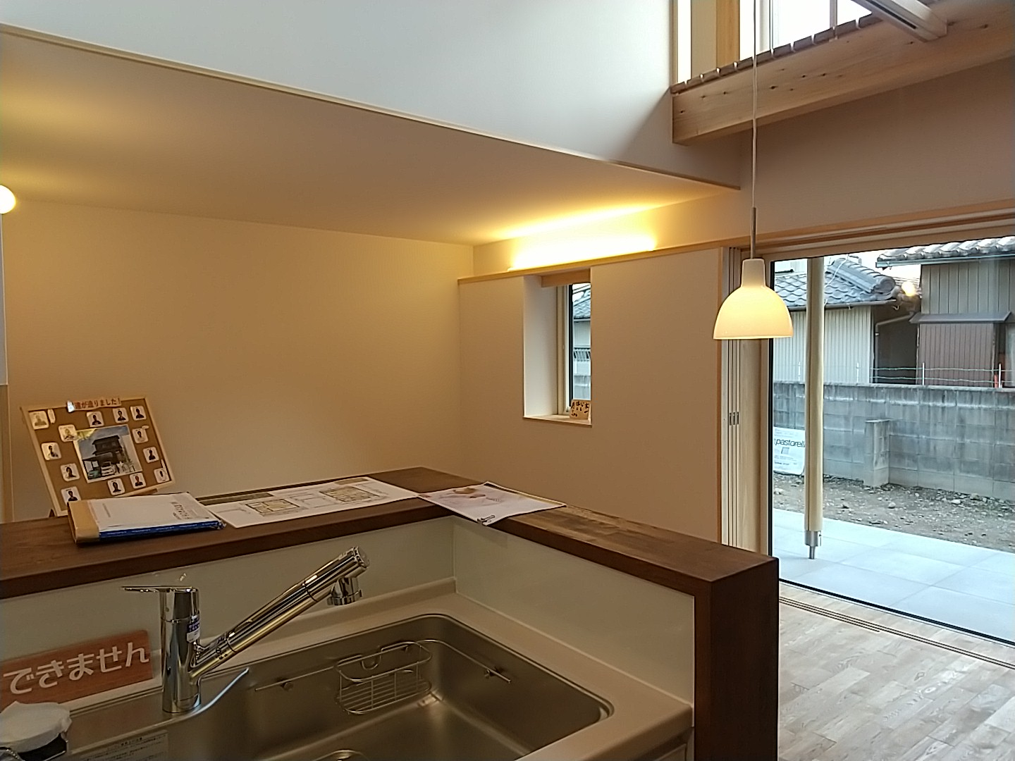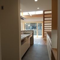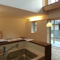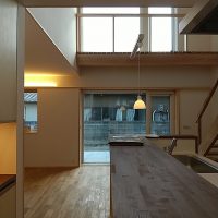 吹抜け空間の大き目の窓からは、光がキッチンまでしっかりと差し込みます。LDKと2階のホールと言う家族の共有スペースで日射を取得することで、北側に設けた部屋も自然と暖かくなる計画です。