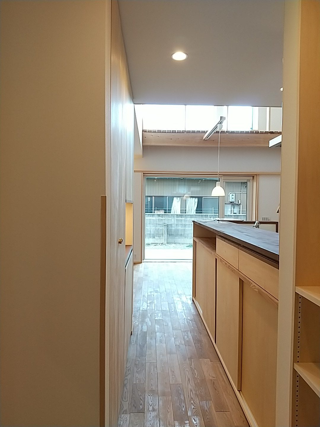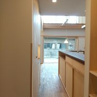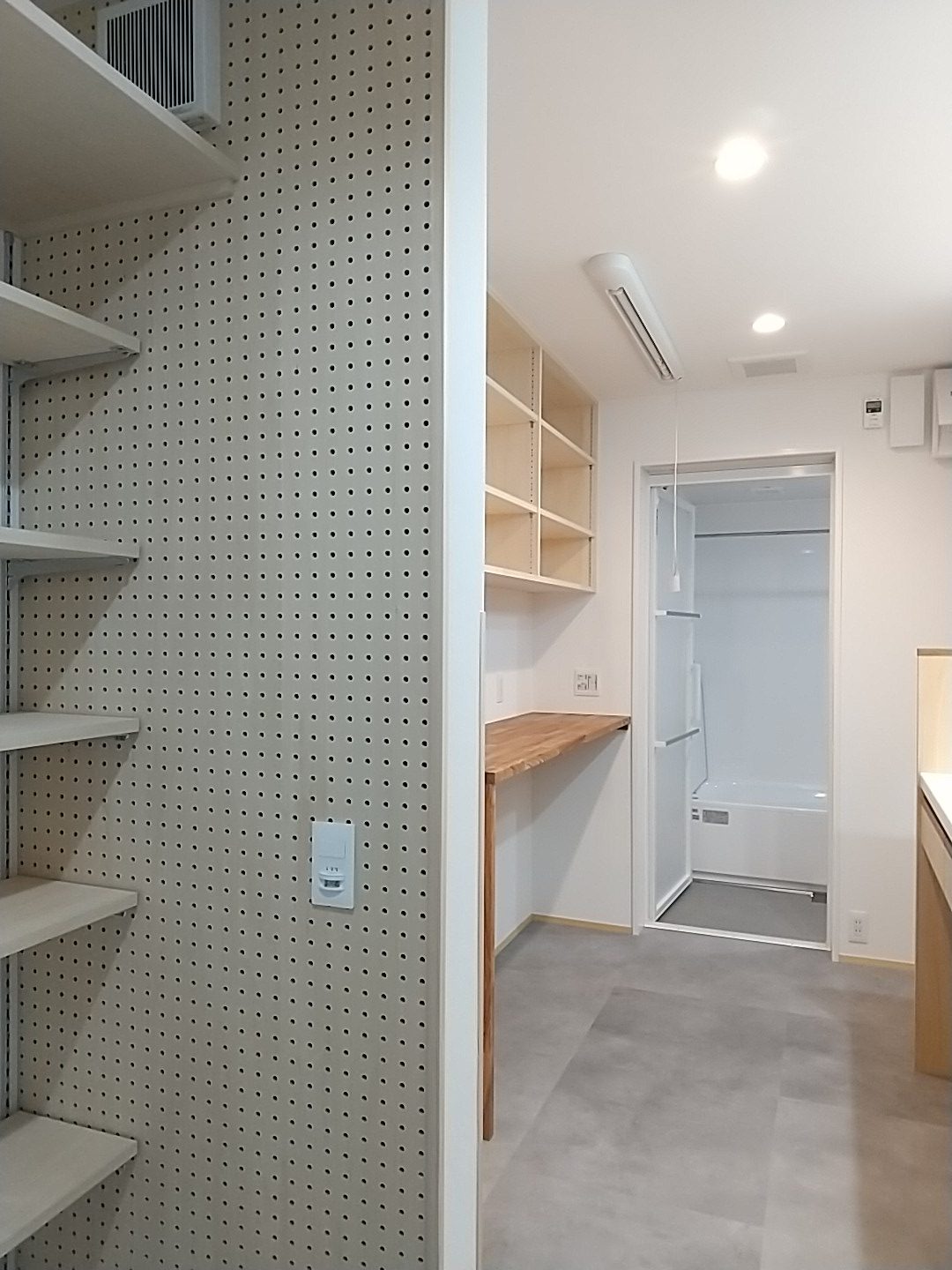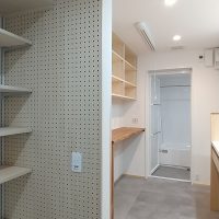 真っすぐ進むと、キッチンに繋がる冷蔵庫置き場兼家事コーナーの家事動線、左に進むと水廻りの前を通りLDKへと繋がります。