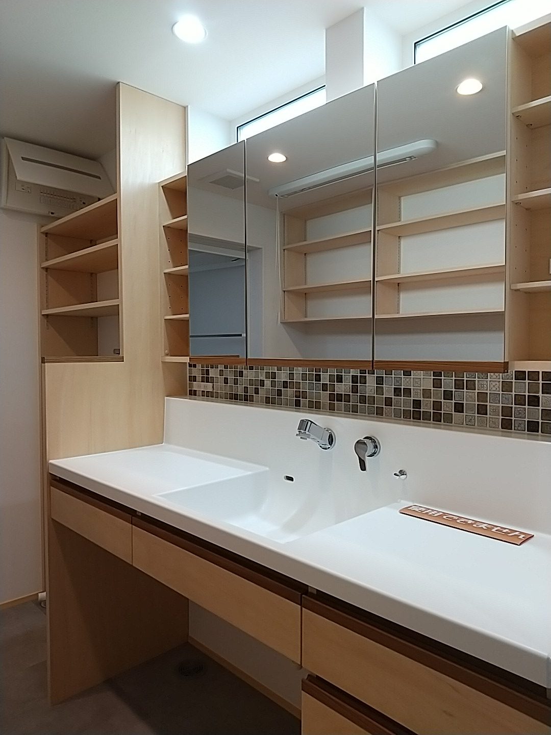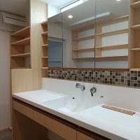 洗濯物が干せる広々とした洗面脱衣室。見た目もこだわりたいですが、毎日使う洗面は、機能性も重視した造作洗面化粧台(最近、造作とよく言いますが、正式には家具屋さんで造ってもらっていますので製作家具です)お好きなタイルを選べたり、引き出しや鏡の収納など、自分の好みに造れて最近人気です。
