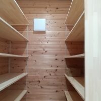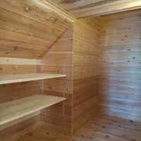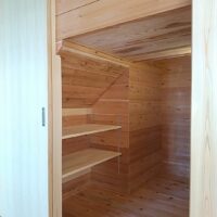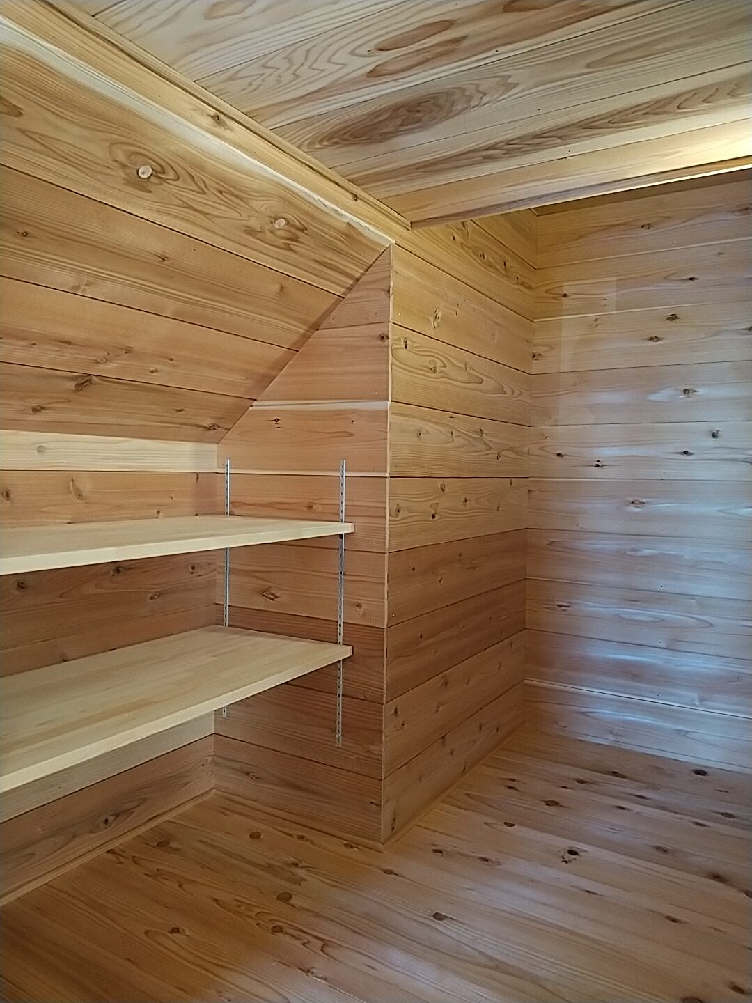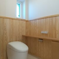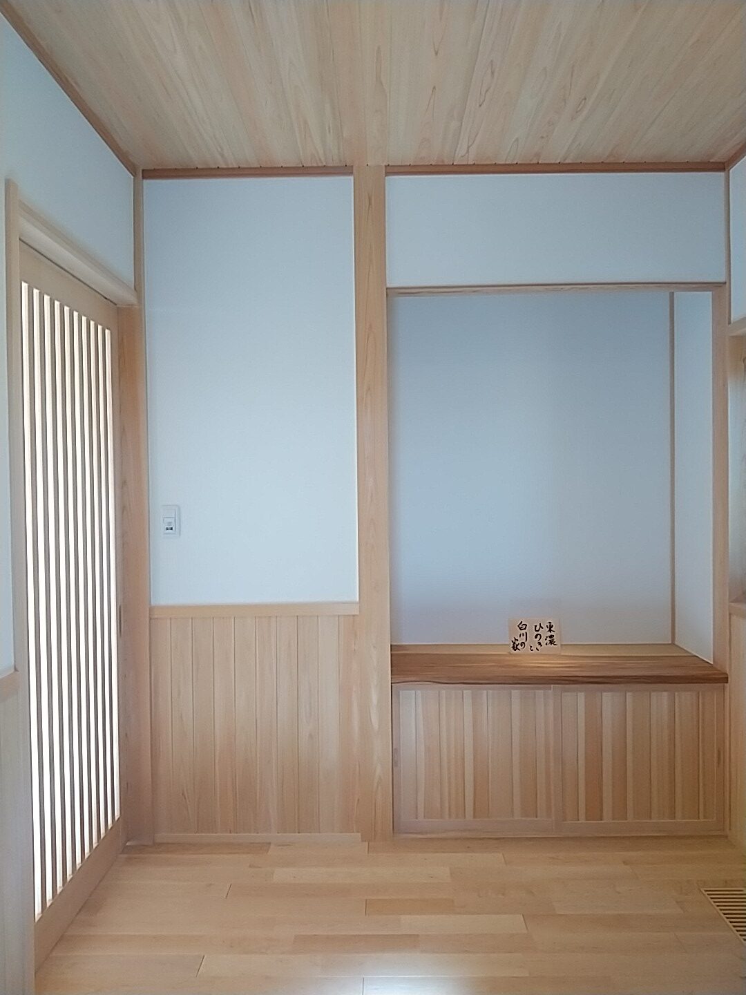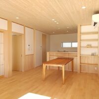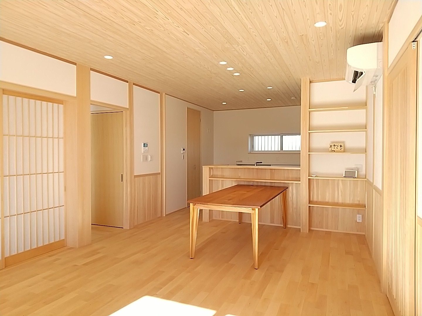 風除室的な役割の玄関ホールの扉を開けると、19.3帖のLDK。こちらも、真壁に桧の腰板、天井は杉羽目板、珪藻土と、床材はもちろん無垢のフローリング(メープル)で、自然素材に囲まれた空間です。デジタルデトックスしたくなる癒しの空間ですね。
