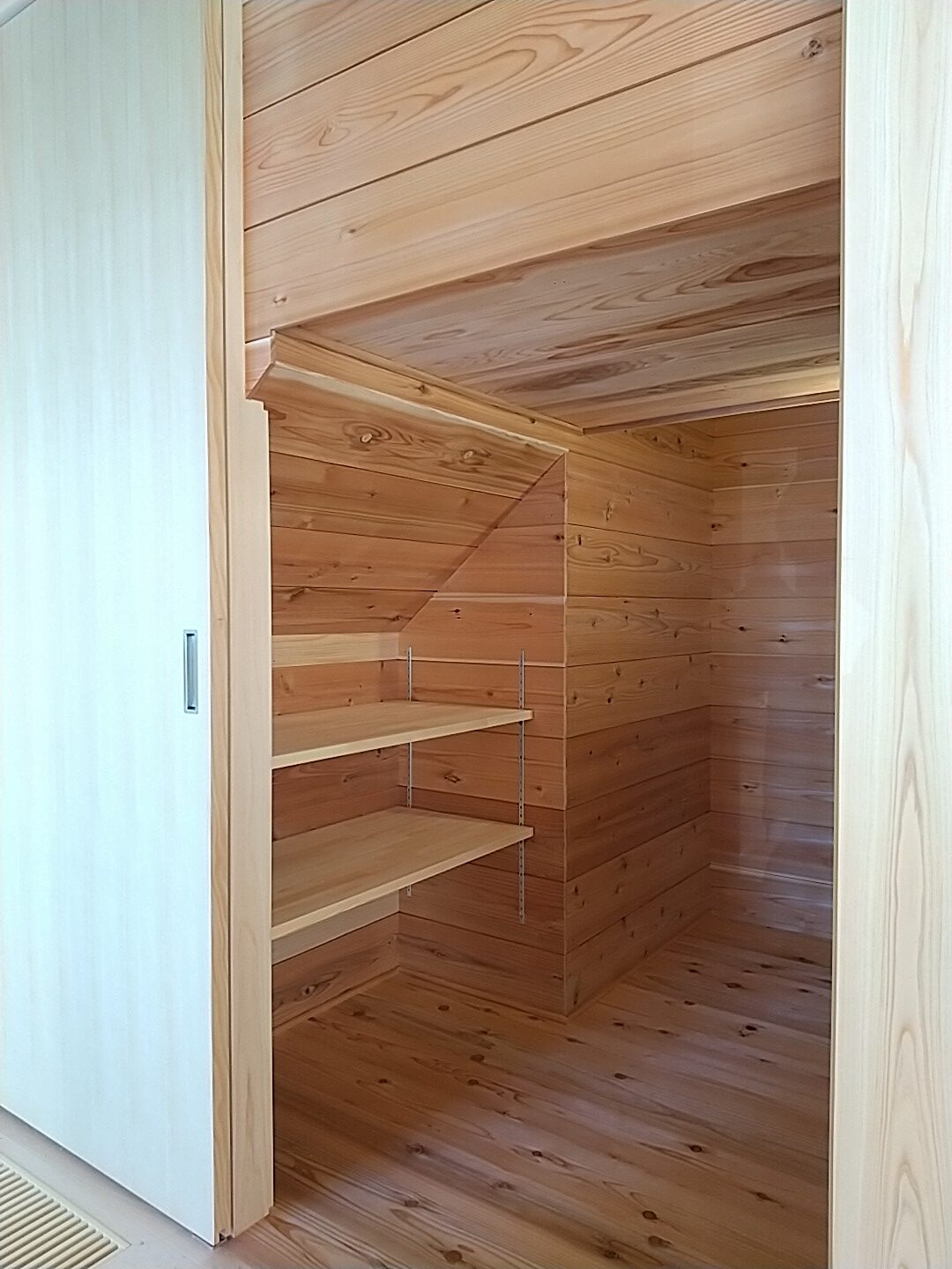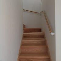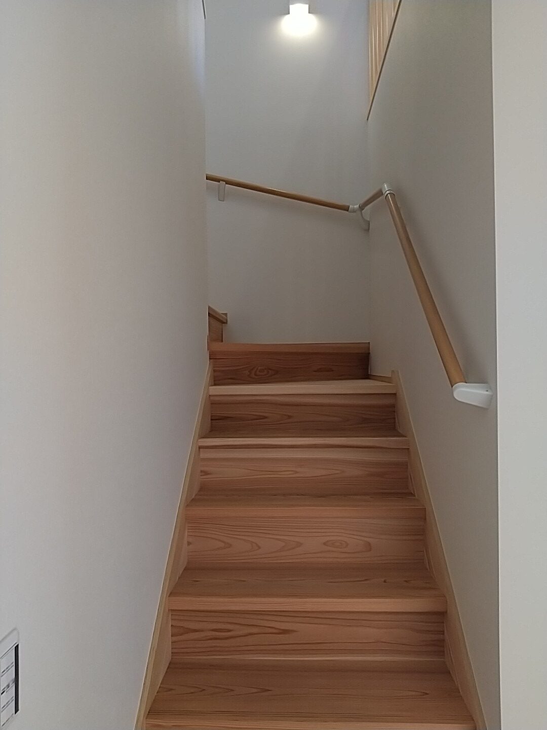 階段下も余すことなく収納に。掃除道具や工具、ちょっとした脚立なども入れておけそうですね。階段には、杉の無垢板を使用しています。杉板は足触りが良く、木目も楽しんでいただけるので、傷はつきやすいですが人気です。手すりは、しっかり握れる既製品の手すりを今回は選ばれました。