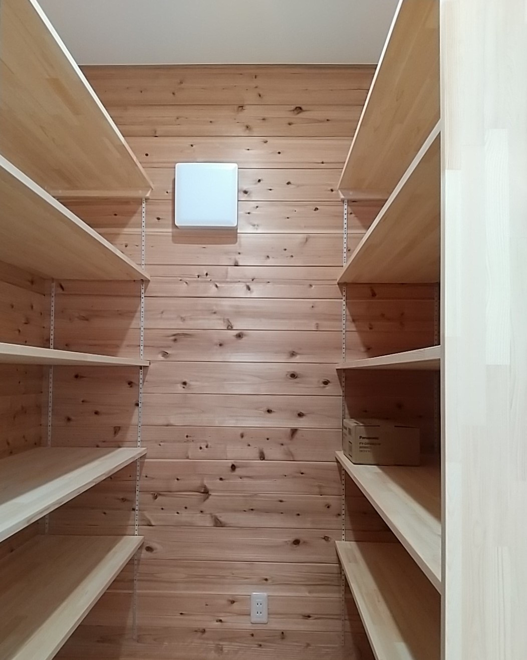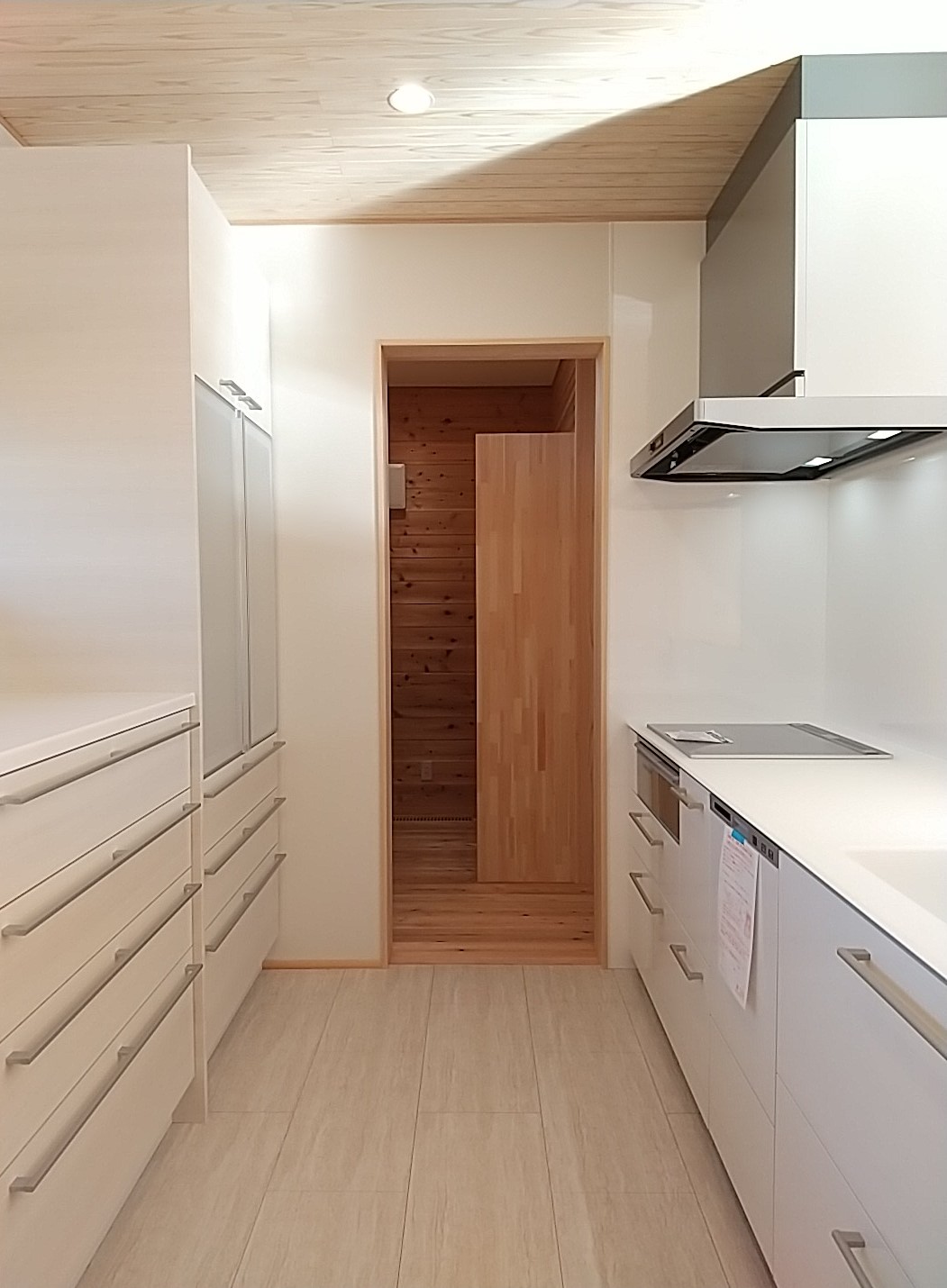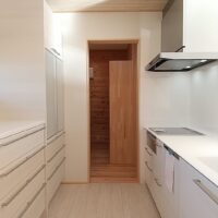キッチンの横からは、パントリーを介して勝手口に繋がっています。勝手口も広々していますので、もしかするとご家族の玄関はこちらになるかも知れませんね。