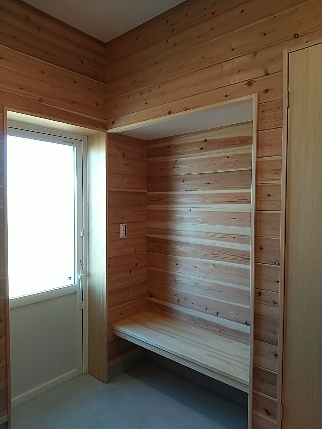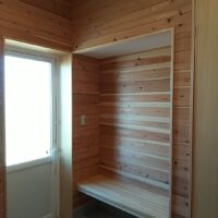 玄関ドアを開けると、今回は真壁(構造の柱が見える収まり)に、腰板や天井に桧の羽目板。ご来場された方々は、木のいい香りを楽しまれていました👍