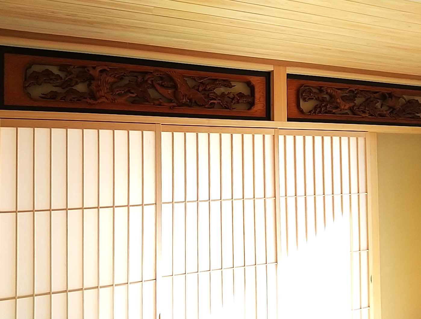 ダイニングテーブルは、旧家の廃材を利用して、家具屋さんでテーブルに生まれ変わり、彫刻が素晴らしい欄間はきれいにしてまた和室へ収められました。古き良きものや、家族の思い出を大切にしたい。そんな想いを形に出来る事が、家づくりにおいても結構あります。