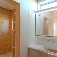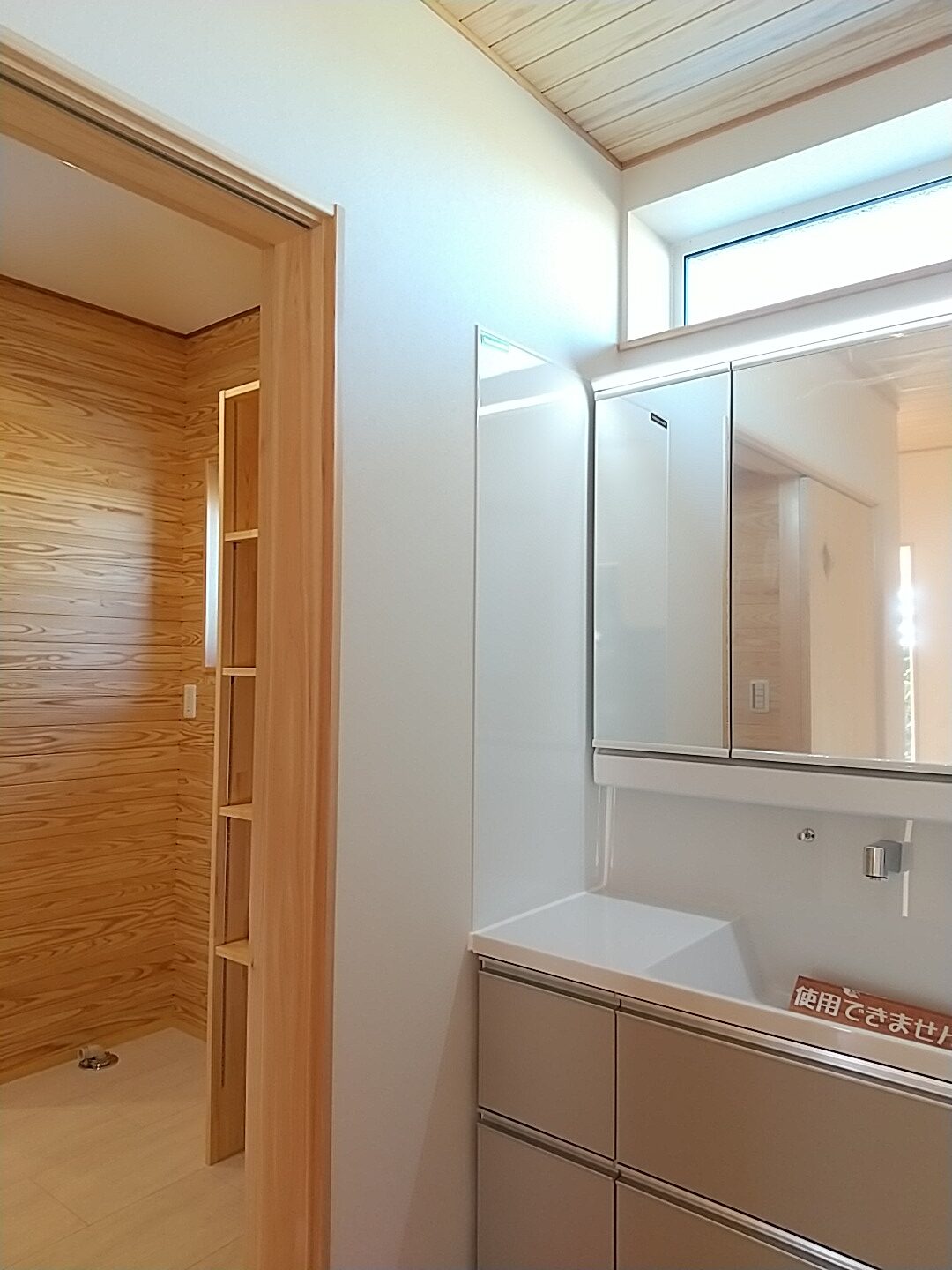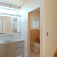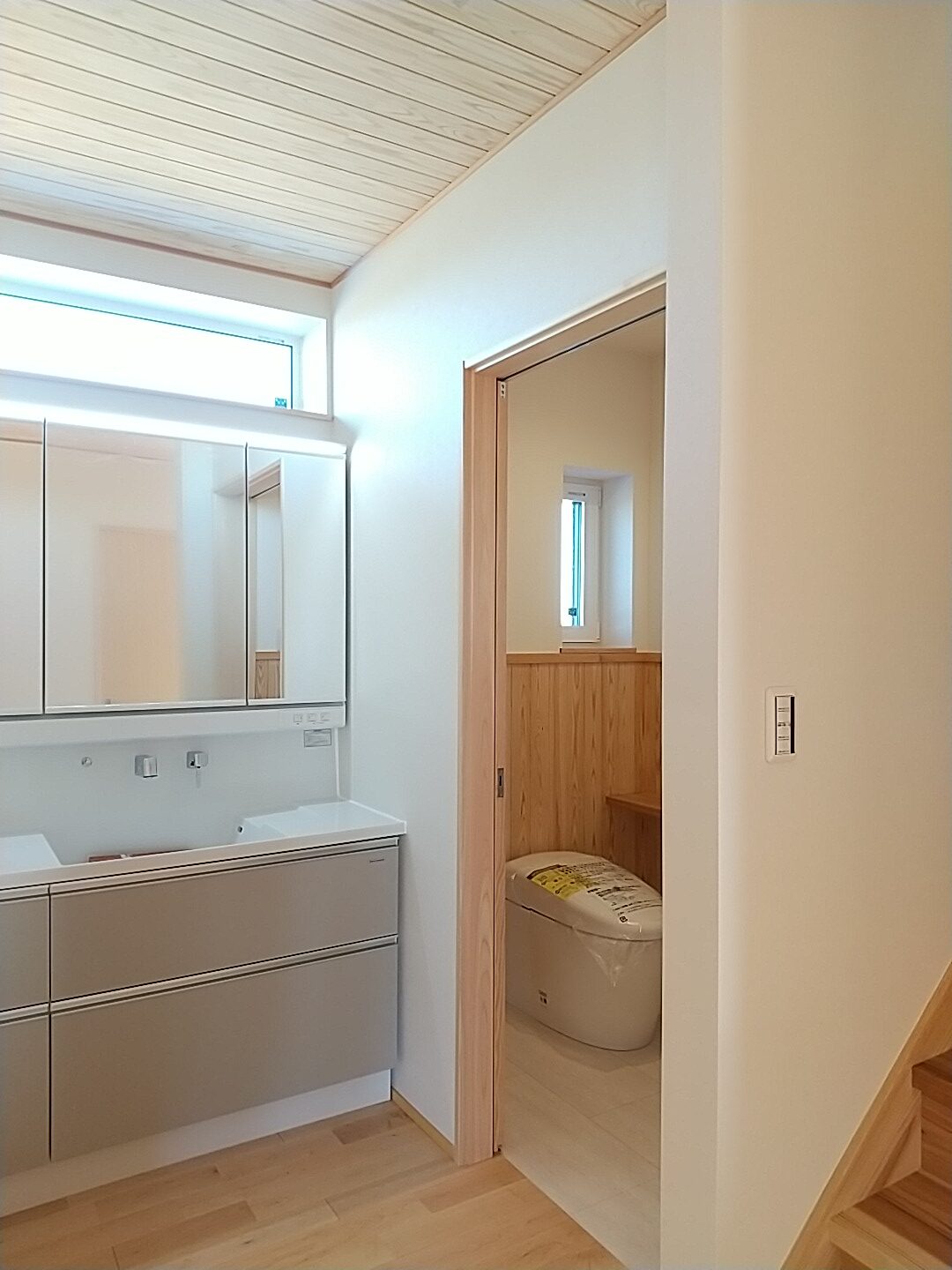 LDKを通り抜け、2階への階段の横に洗面があり、浴室⇔脱衣室⇔洗面⇔トイレの非常に使い勝手の良い並びになっています。1階の洋室からも近いので、夜中にトイレに起きる方には嬉しい配置です。