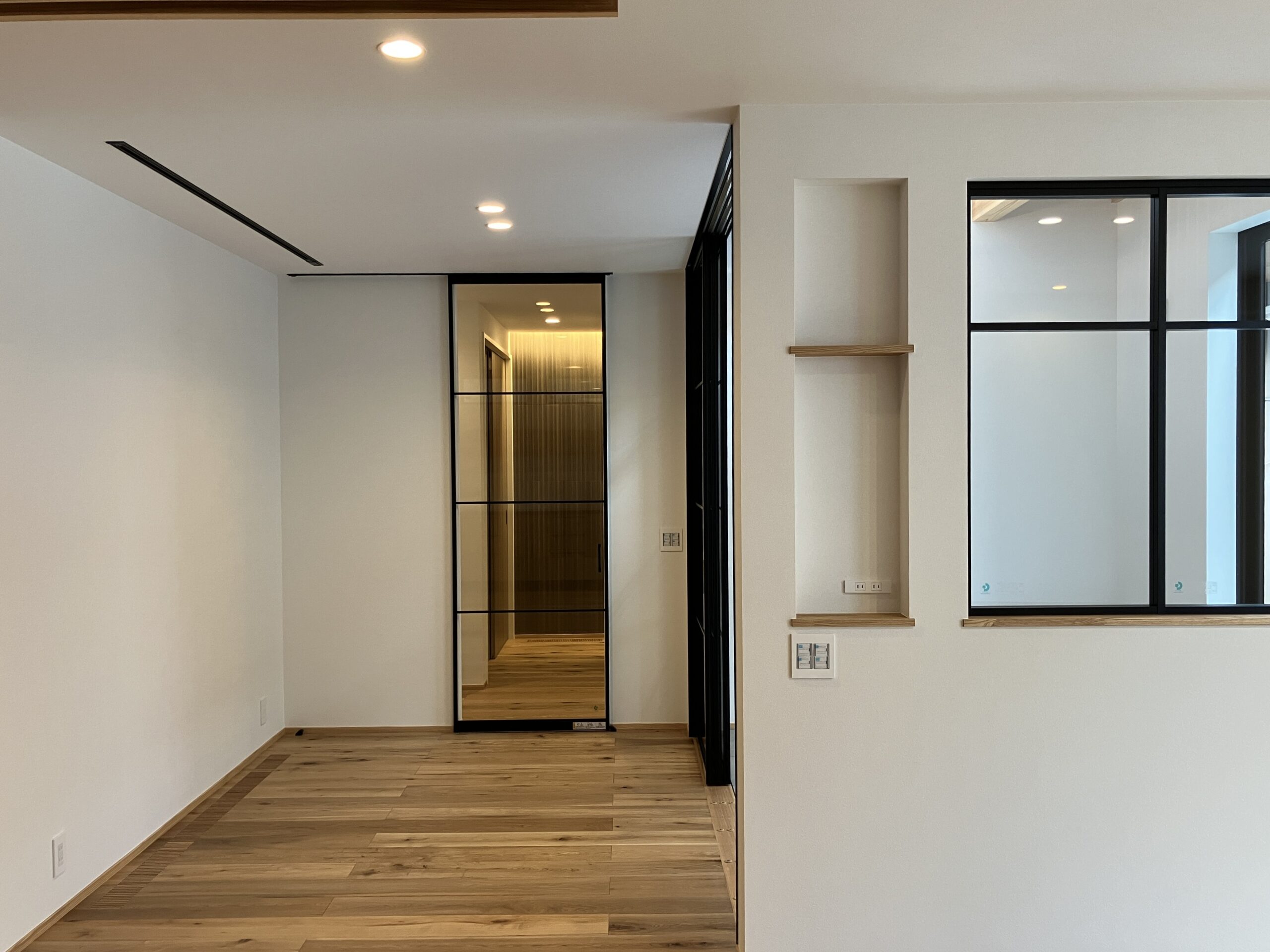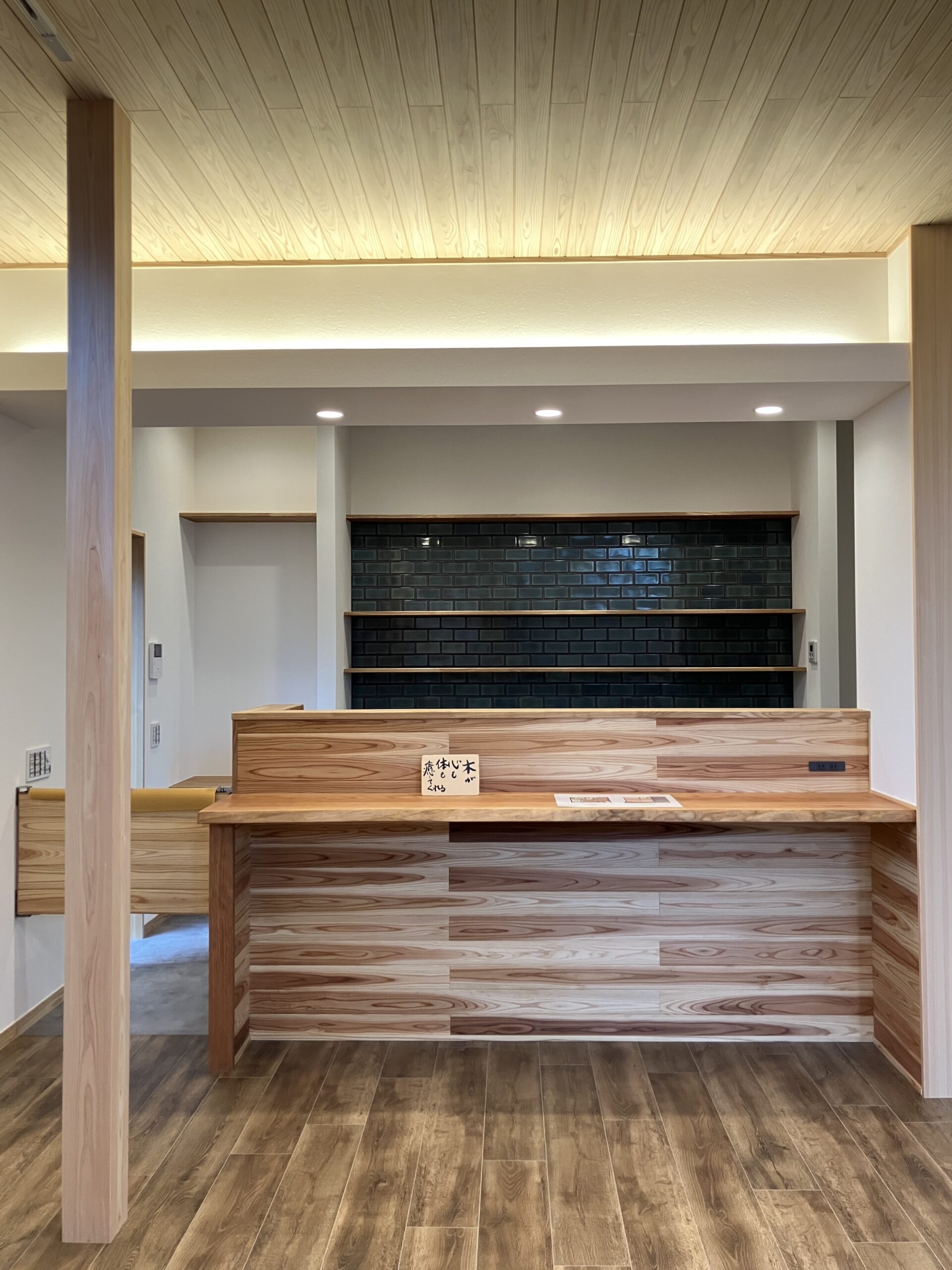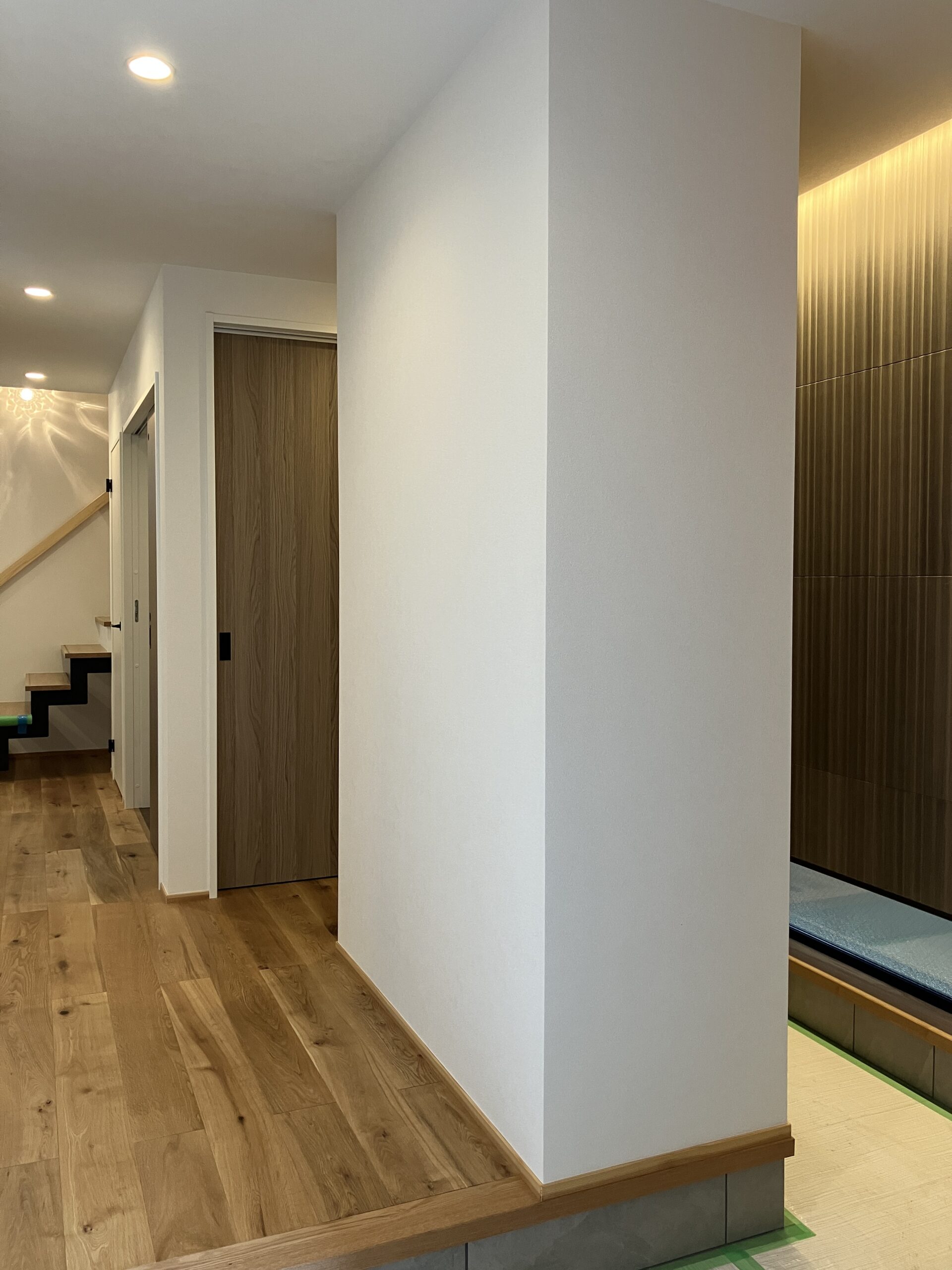 母屋は、玄関に入ると、右手にシューズクローク。限られたスペースですが、収納棚が見えないようにすることで、建具で仕切らなくてもよくなり、視界が通るので広く見えます。シューズクロークの壁にはエコカラットを貼られ、玄関やLDKからも楽しめます。エコカラットは、調湿効果や消臭効果がありますが、デザイン性もあるので貼っても見えなくなってしまうともったいない。ko様邸は、エコカラットを貼るために造られたようなシューズクローゼットになりました👍間接照明(コーニス照明)もいい感じです。