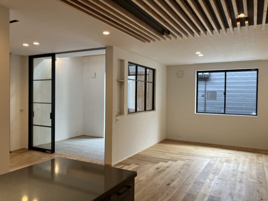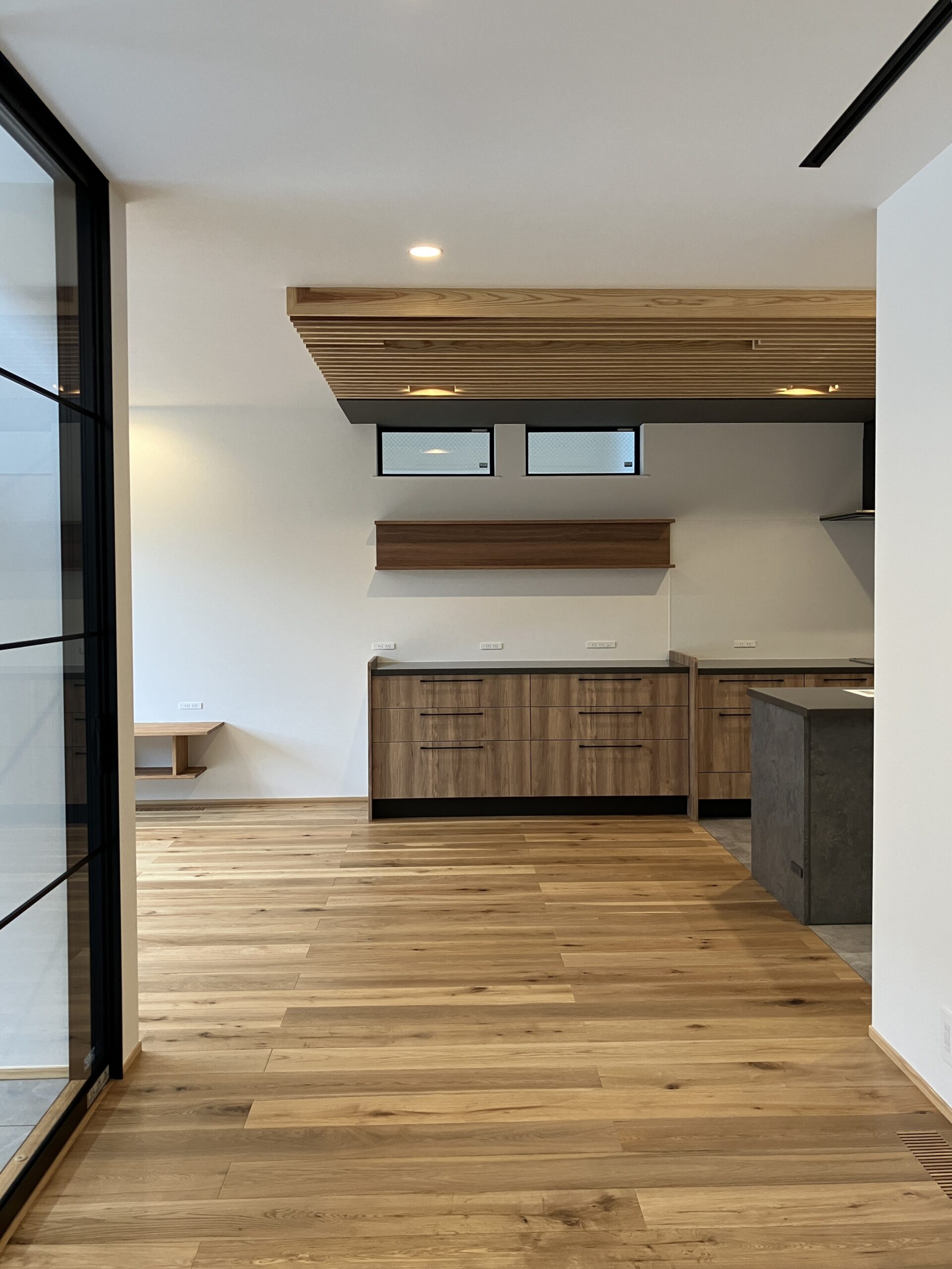 ダイニングキッチンスペースは、広い空間に変化を付けたいという事で、1段天井を下げています。途中、o様のアイディアで木製ルーバーを取り付ける事になりました。リビングのヘリンボーン風の床の張り方といい、こだわりを感じる部分です。