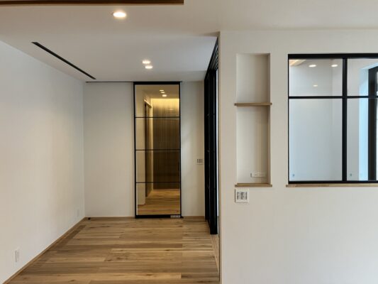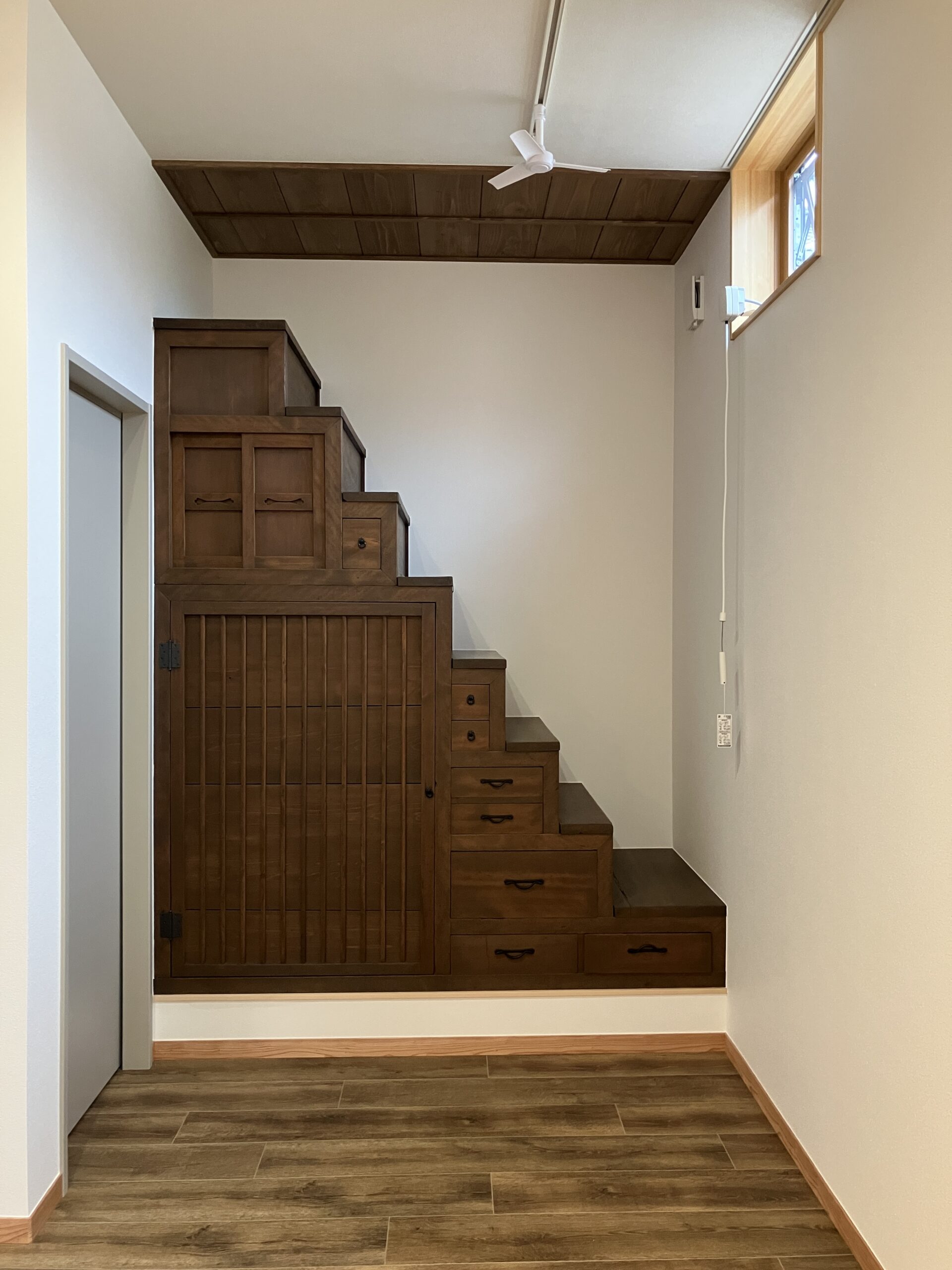 階段室の手前には和室があります。お父様のご兄弟が気軽にお参りできるように、仏間を離れに設けられました。真壁納まり(構造の柱が見える納まり)にしたので、ヒノキのいい香りがします👍