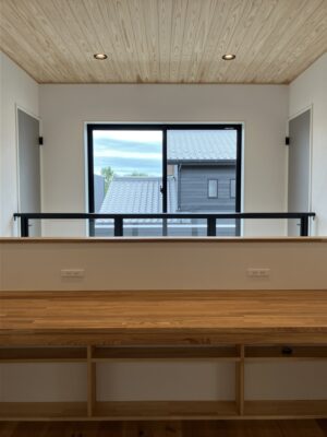 アウトドアリビングの上には、吹き抜けとキャットウォーク。いつものミノワ仕様の手すりではなく、今回はアルミの手すりを採用されました。小さめの吹抜けなので、視界が通って広く見えます👍外観は町並みに配慮されていますが、中に入るとスタイリッシュなko様邸です。