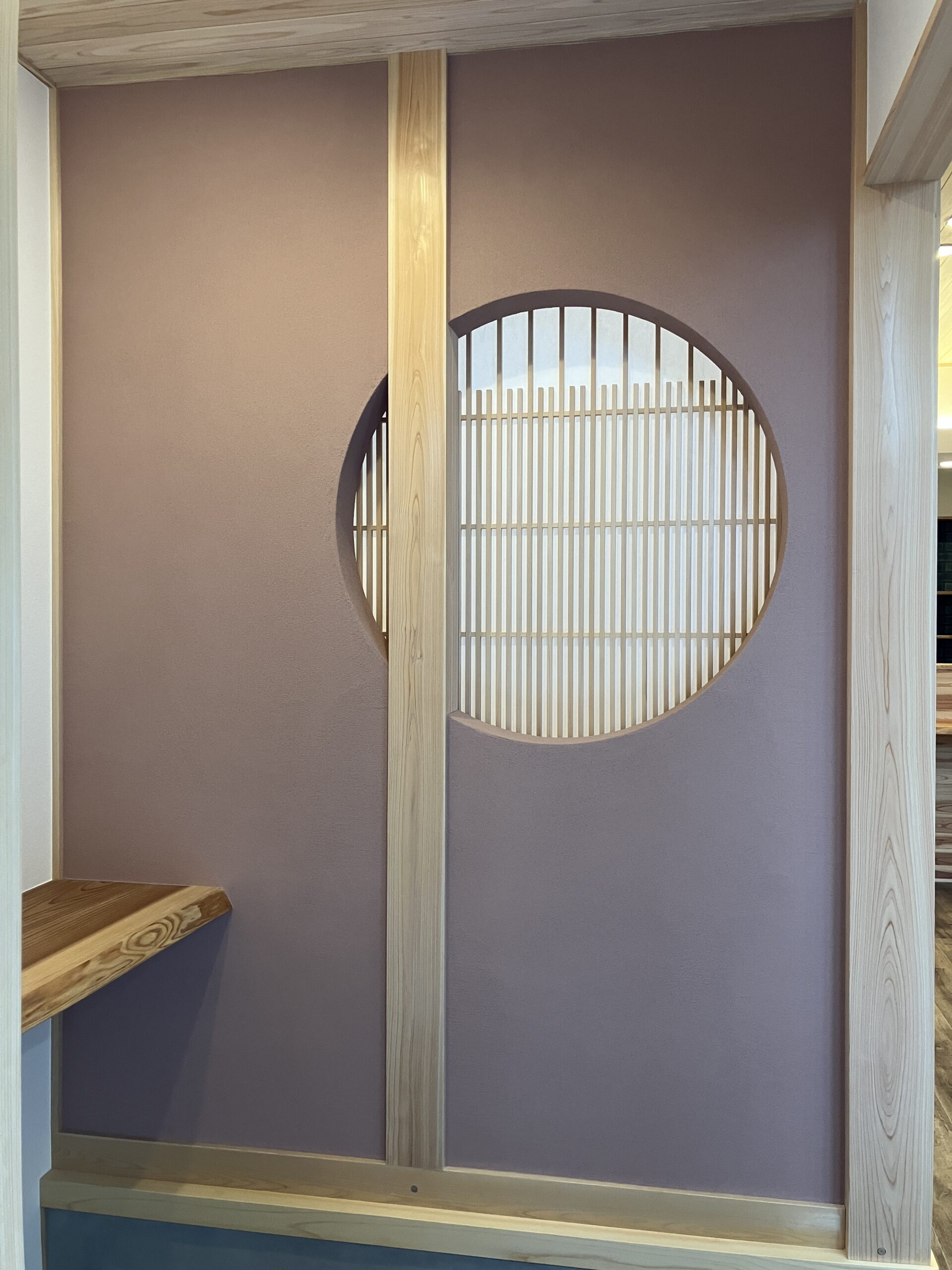 離れは、ご来場された方々にも、「ミノワさんらしいね」とおっしゃっていただけるほどの和の雰囲気です。玄関には旧家にあった丸窓を再現。犬山の城下町で良く観る格子模様を掛け障子に採用されました。玄関を通り正面には、旧家で使われていた収納階段がf木工さんによってきれいに蘇り、飾り棚として設置されています。