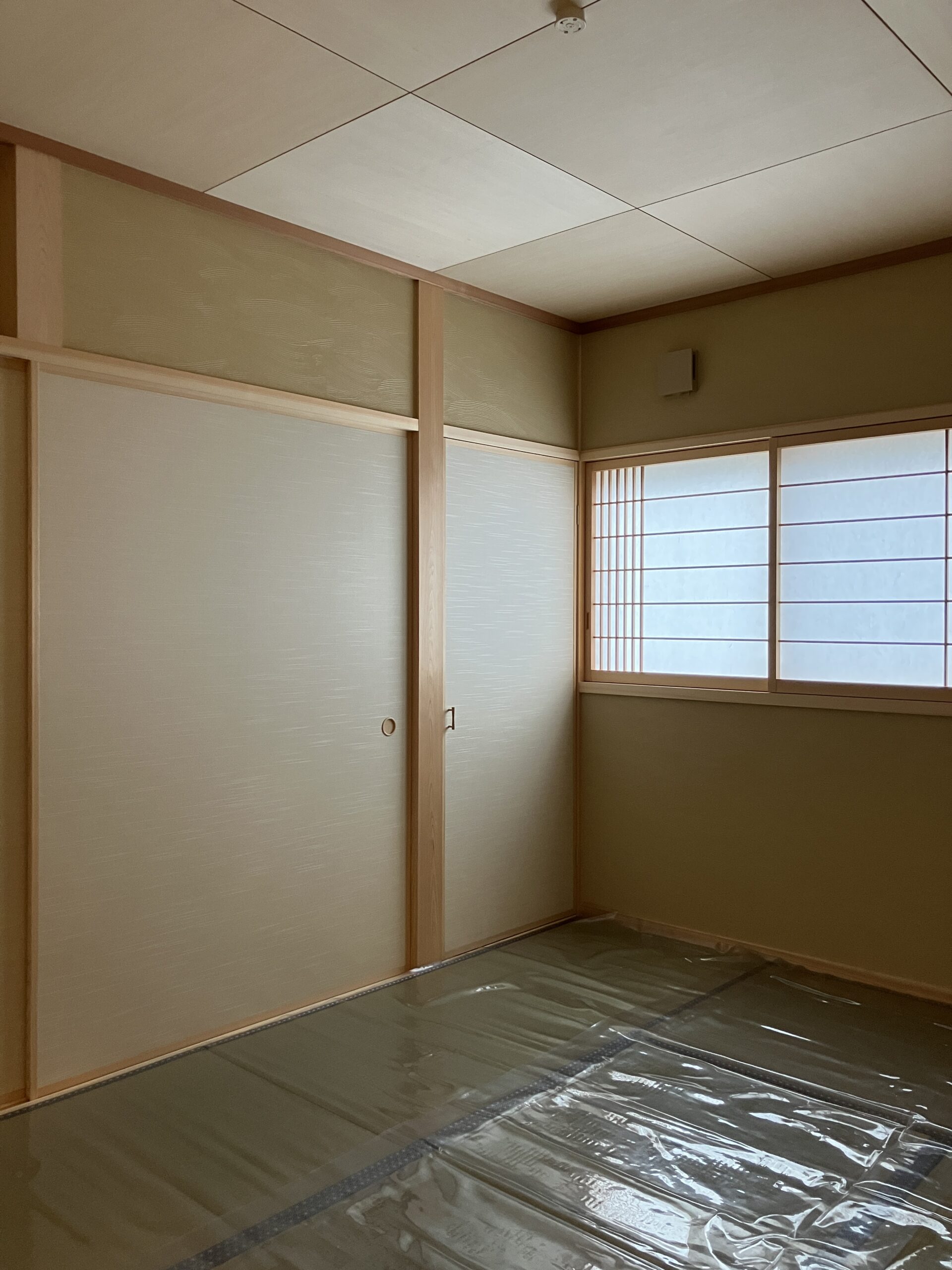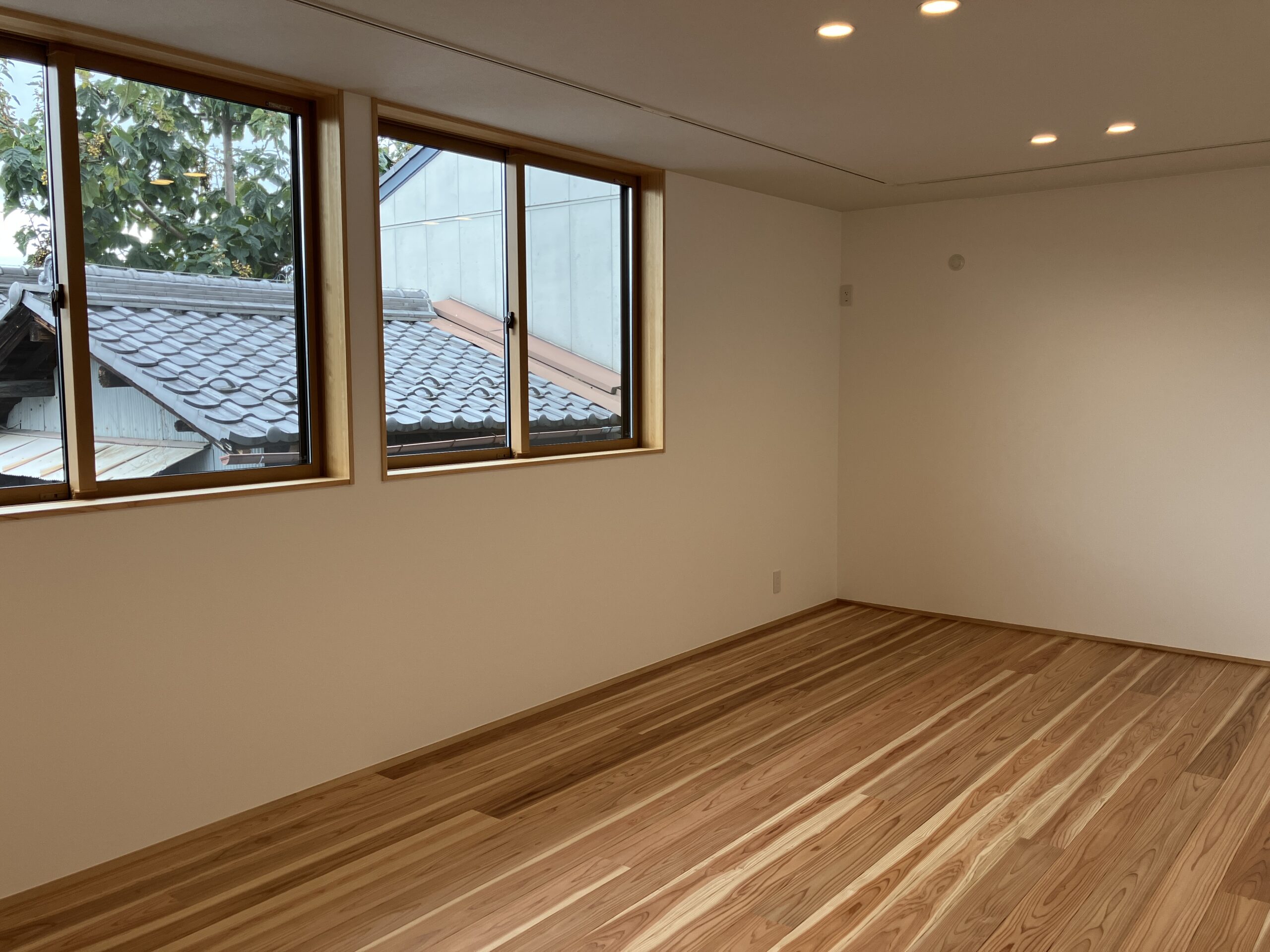 2階の洋室にも、多才なおじいさまの遺された油絵の作品を飾れるように壁際にピクチャーレールを取り付けました。早く眠っている作品が飾られたところを見てみたいです。床材は、久しぶりに無節の杉フローリングを使用しました。岐阜県の県産材を使う際にもらえる補助金で、節有から無節にグレードアップされました👍こんな補助金の使い方もよいですね。