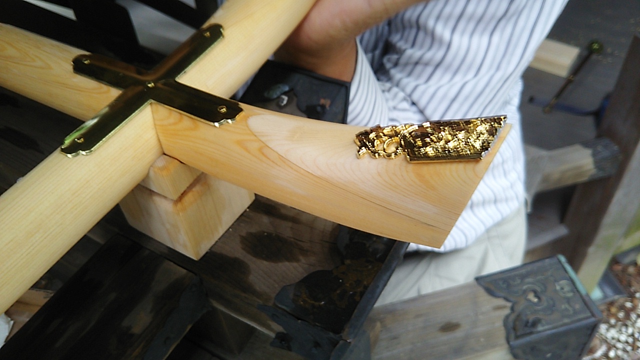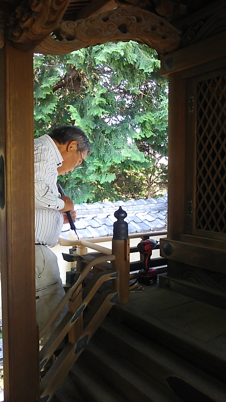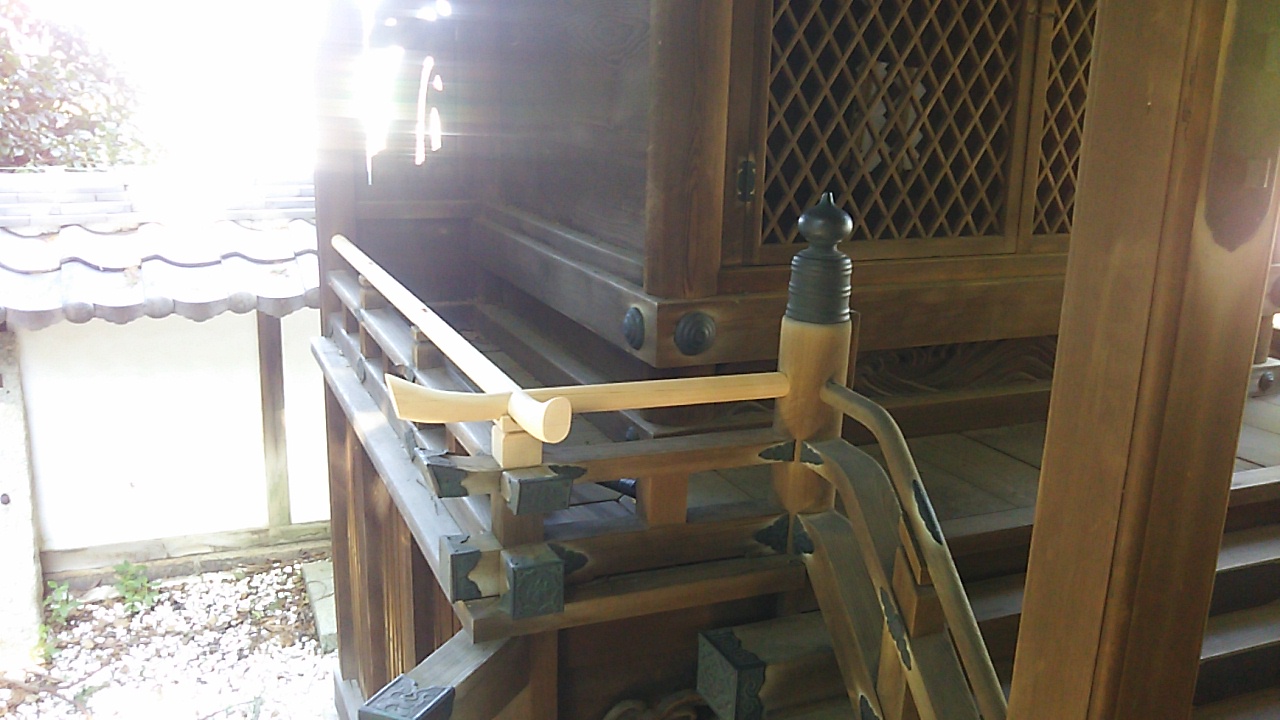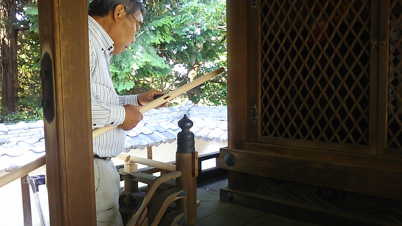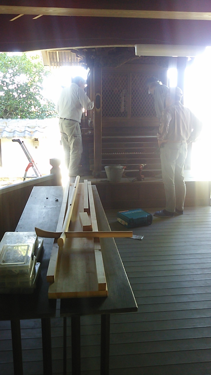江南営業所そばの神社の欄干が長年の風雨により腐り落ちてしまったので、区長さんより依頼を受けて交換作業に入りました。新たな欄干の部材は当社会長が工場であらかじめ作成したものを取り付けます。(逆光のせいか、神社の奥殿という場所のせいか後光が差しているように見えます)