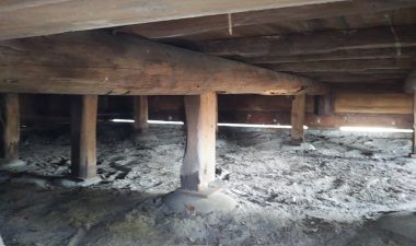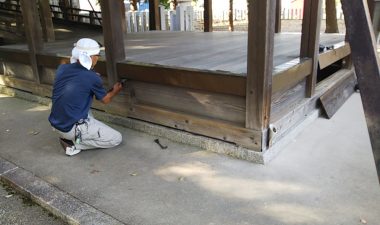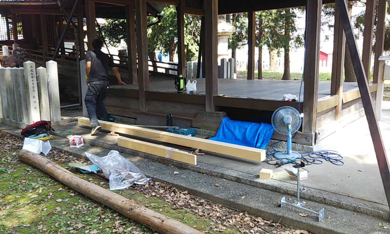 今回は社殿の前の舞台(?)にあたる部分の床下のシロアリ駆除に入ったそうですが、その際業者さんが土台が半分以上食害にあっているという部分を発見されたそうで、交換を依頼されました。上部の床と根太を外さずに大引のみ交換・・床下に入り込める部分が無いか調べています。
