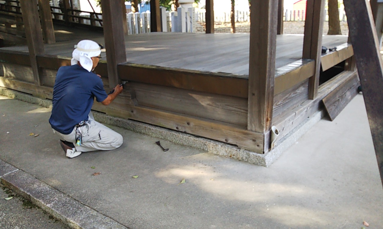 神社の床下で直射日光は射さないのですが、それでもこの日は相当な暑さ。外から扇風機を最強にして風を送り込みます。と、大工さん『蚊も一緒に吹き込まれてきますねぇ』。蚊取り線香もスタンバイしました。