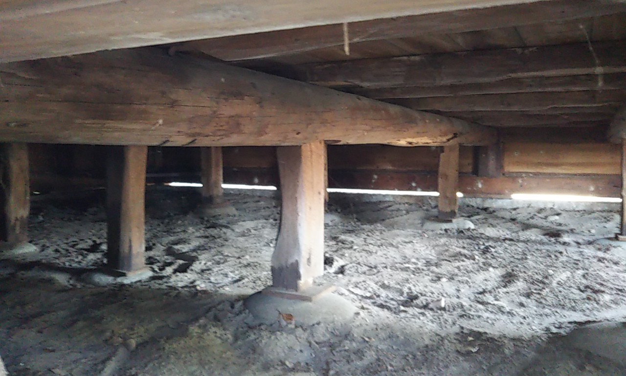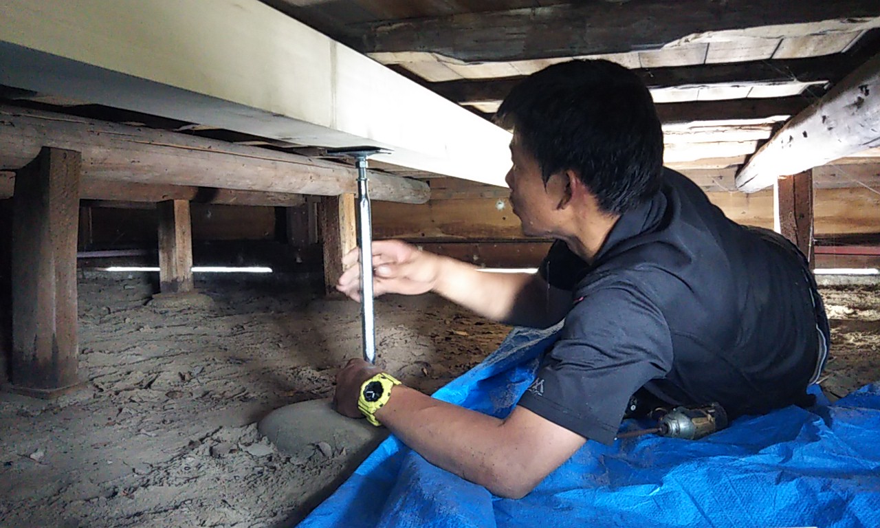 古い大引を撤去して新たに米ヒバ材の大引を挿入、木製の床束ではまた白蟻に食われるといけませんので、新築住宅で使用する鋼製束を取り付けました。・・・なんだかバチ当たりな気もしますが地区長さんも『時代の流れだね』と、見物されていました。