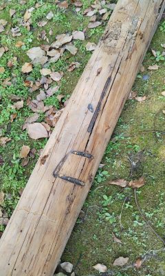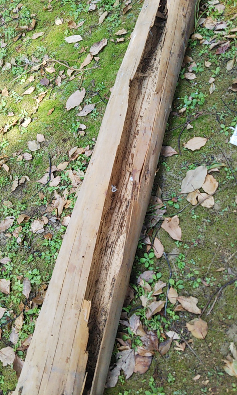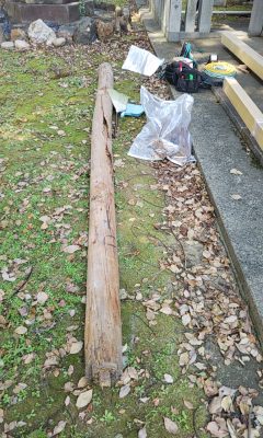 撤去された古い丸太の大引。両端には鑿で彫ったような『コト』(?)の文字。建立当時の番付と思われます。そして白蟻に食い荒らされた部分。直径の半分ほども食われてしまっていました。