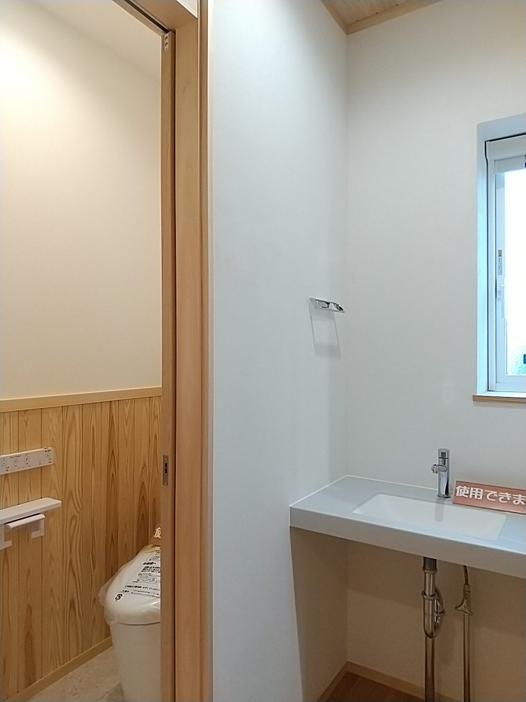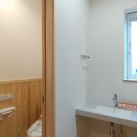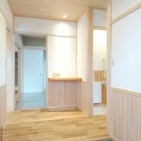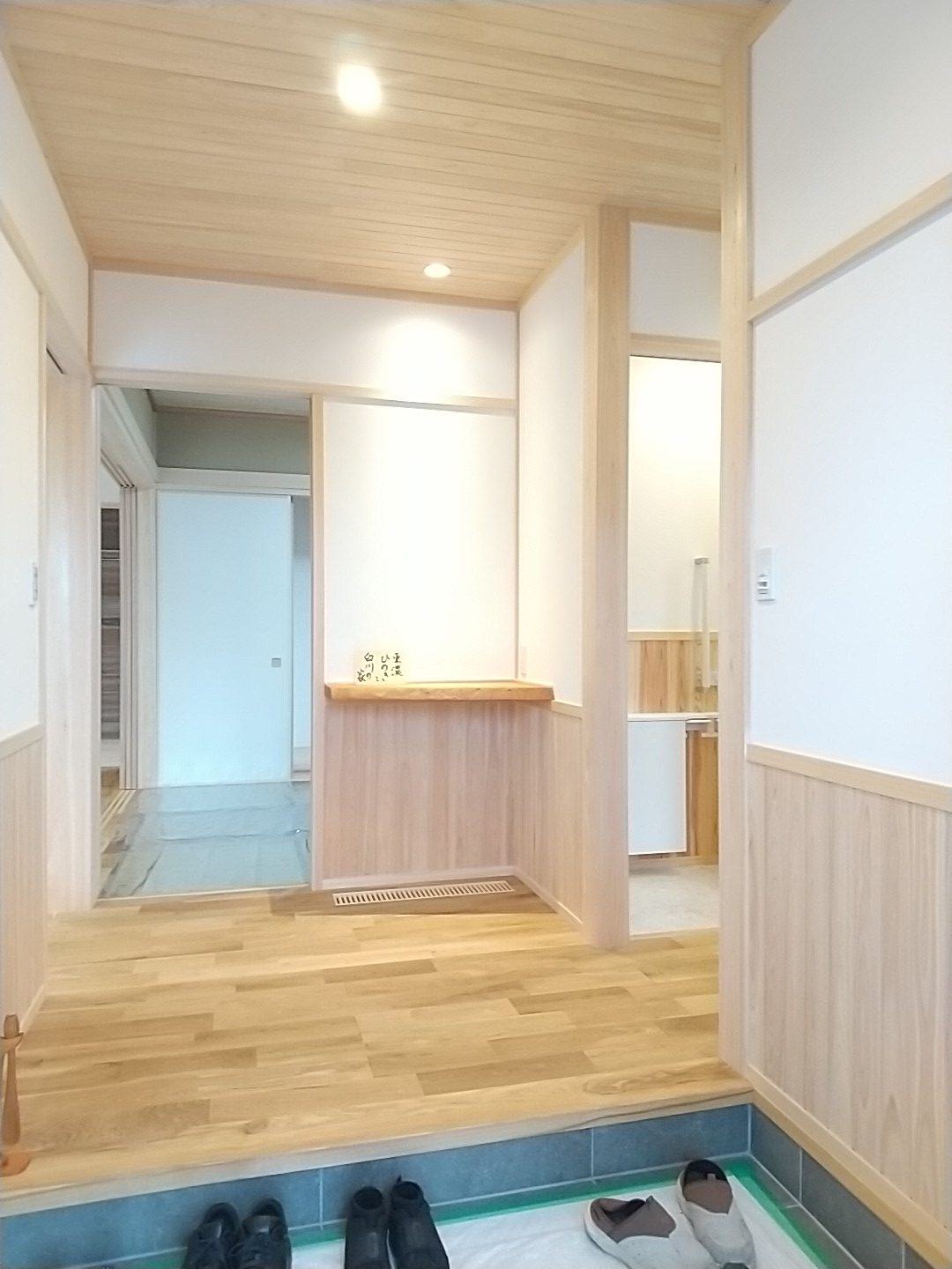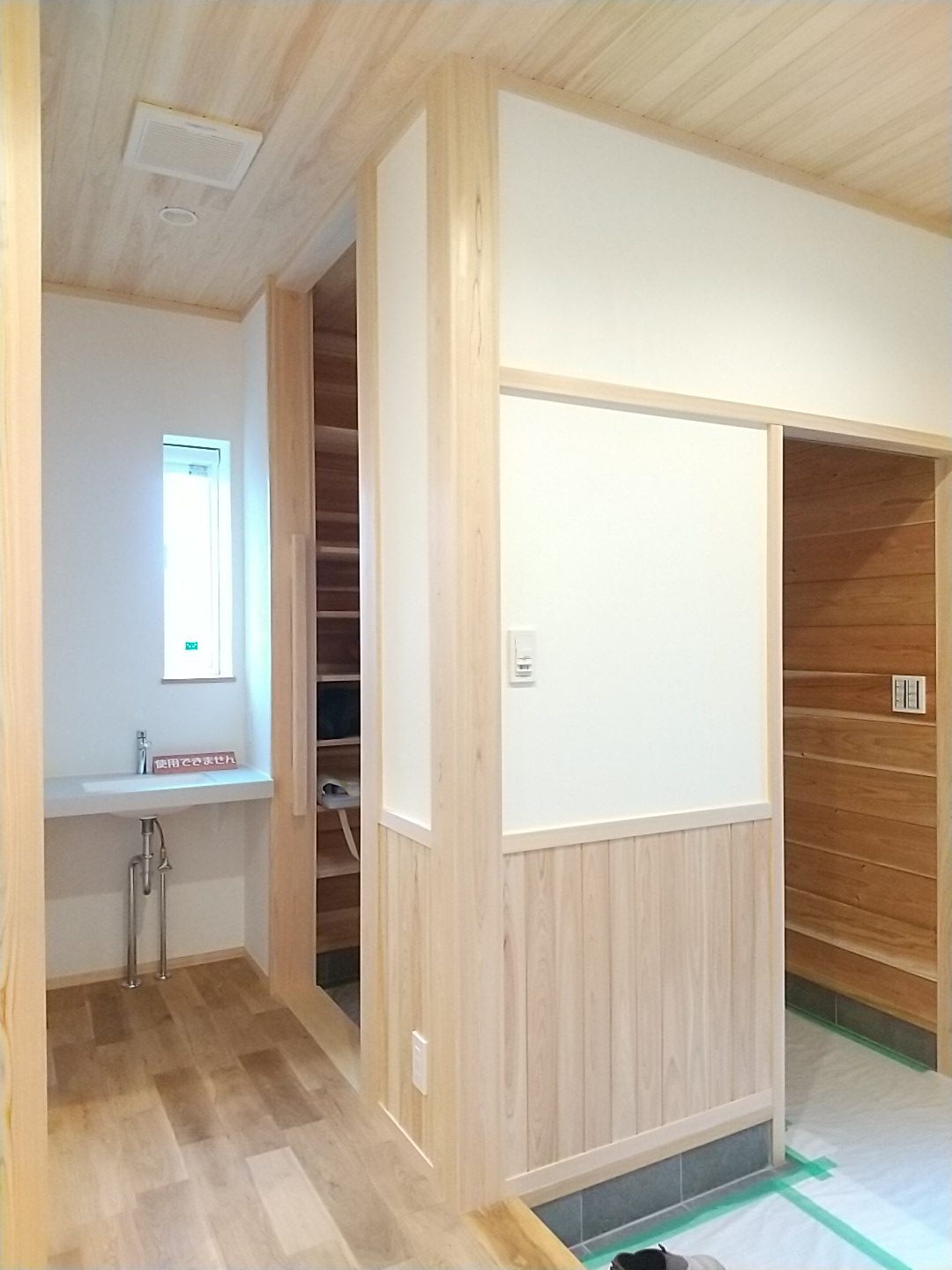 玄関は、久しぶりに東濃ひのきの柱が活かされた真壁の仕様です。天井と腰板も、桧の羽目板。ミノワ鉄板仕様👍ヒノキのいい香りが、疲れを癒してくれます。t様のご要望①『お寺さんが月参りに来られるので、LDKを通らず和室に入ってもらえるようにして欲しい』という事でホール正面の扉は和室へ、右手はシューズクローク、手洗い、トイレもお貸しする事もあるかも知れないので、2つ目のトイレをこちらに配置されました。