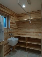 t様邸も、脱衣室はランドリースペースとしても使われる仕様です。ご職業柄、洗濯物が多いので、室内に干せるスペースもありますが、乾太くんも途中で追加採用されました。キッチンの加熱機器はガスを選択されていますので、乾太くんだけで基本料金がかかるわけではないですしね~いいかなぁと思います。
