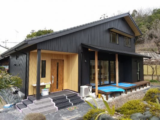 今回は、社員大工w邉棟梁のお宅です。断熱は、充填断熱120㎜、付加断熱55㎜、サッシは樹脂サッシ。UA値0.35w/㎡・kの住宅です。付加断熱は、いわゆる外断熱です。関市は地域区分6ですが、6の中でも比較的寒いエリア。w邉棟梁も、いろんな現場で付加断熱の良さを体感し、付加断熱は絶対にしたいと選択されました。外壁はガルバリュウム鋼板、屋根は瓦とメンテナンス周期が長い物を選ばれています。職人さんならではの選択ですね。でもガチガチにメンテナンスの事ばかりを考えると味気ない家になってしまうので、玄関廻りや軒裏は杉板を張り、アクセントになっています👍